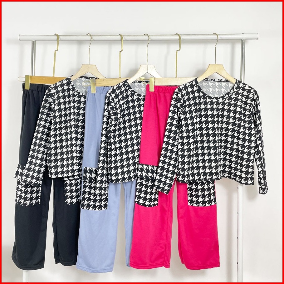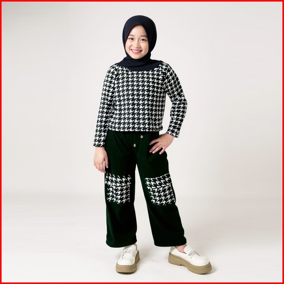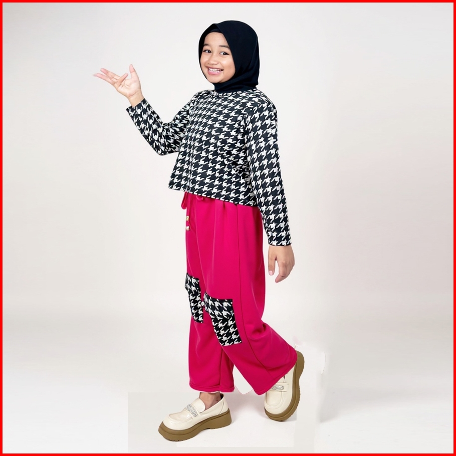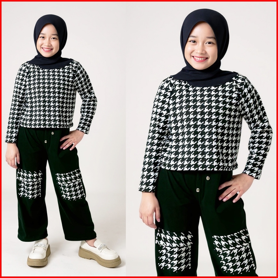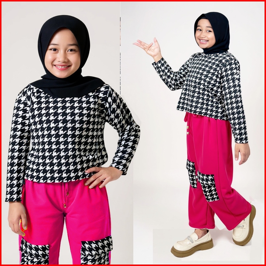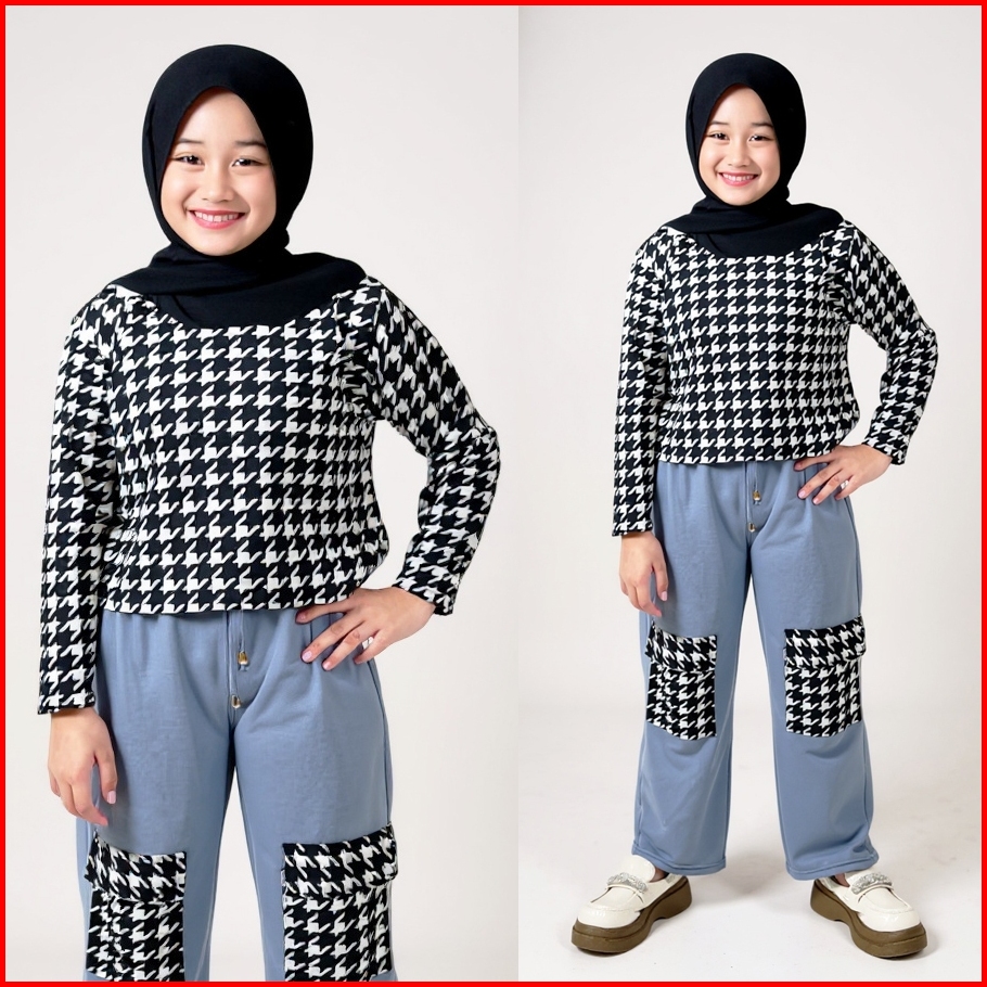 Set Anak Perempuan Kargo Baju Dan Celana Cargo 2-13 Tahun Motif Houndstooth Carlina Fashion