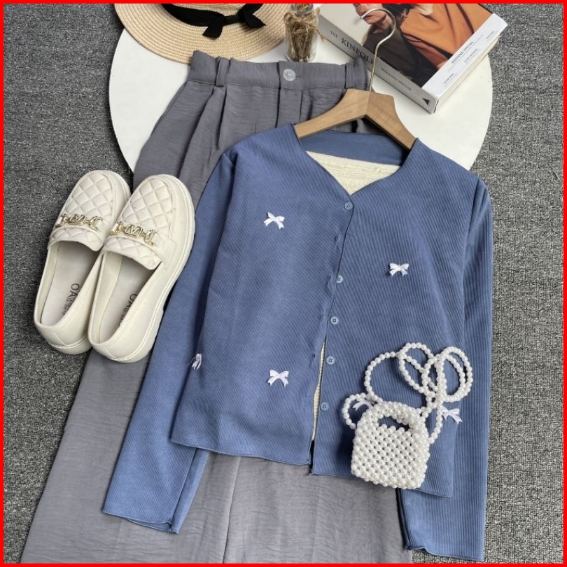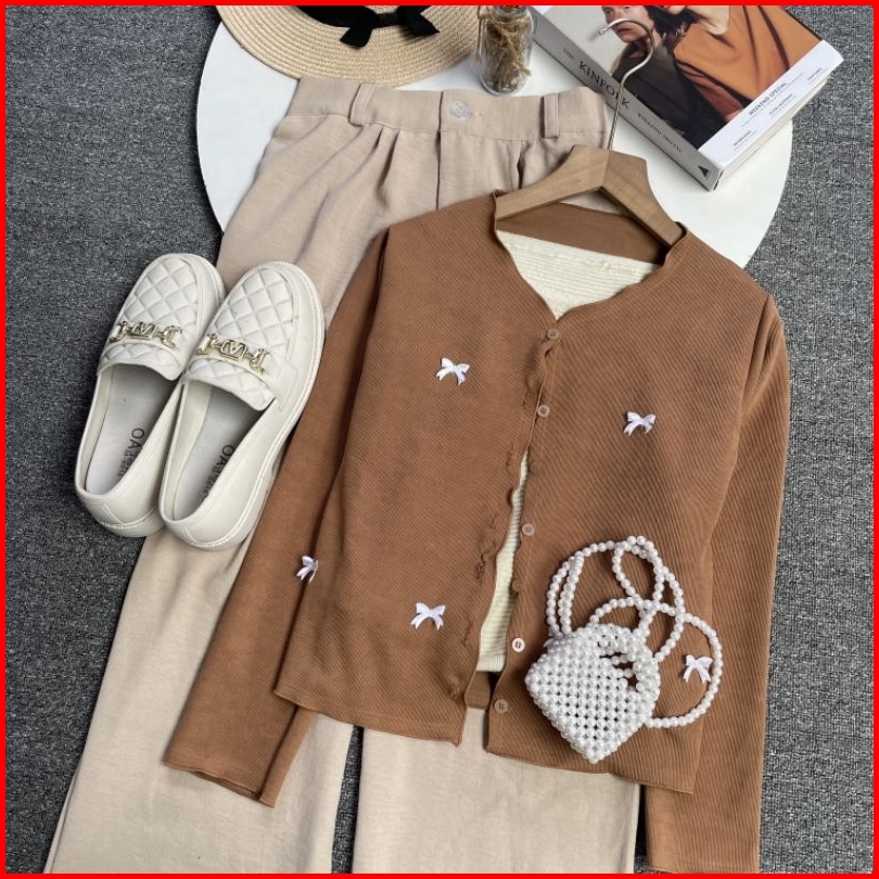 Vienetta Id - One Set Setelan Wanita Kekinian Terbaru 2025 Celana Panjang Cardi Pita Remaja Coquette Cardigan Buat Hango
