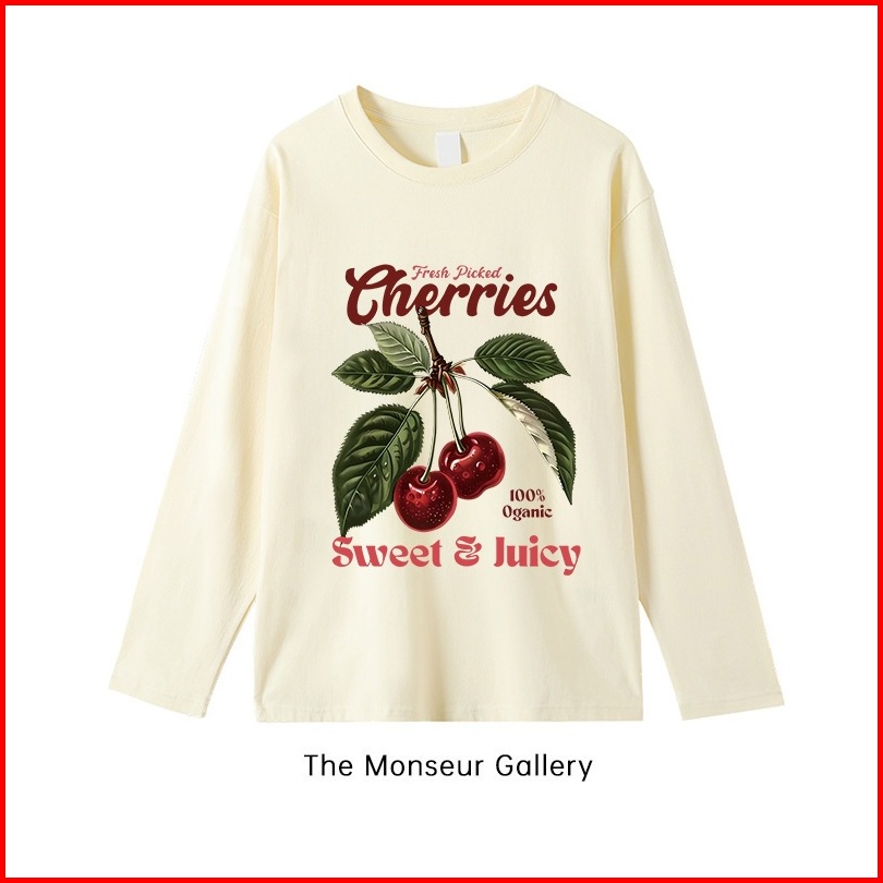 The Monseur Gallery Baju Kaos Wanita Lengan Panjang Kaos Oversize Wanita Baju Atasan Wanita Simple Cherry Print Kaos Wan