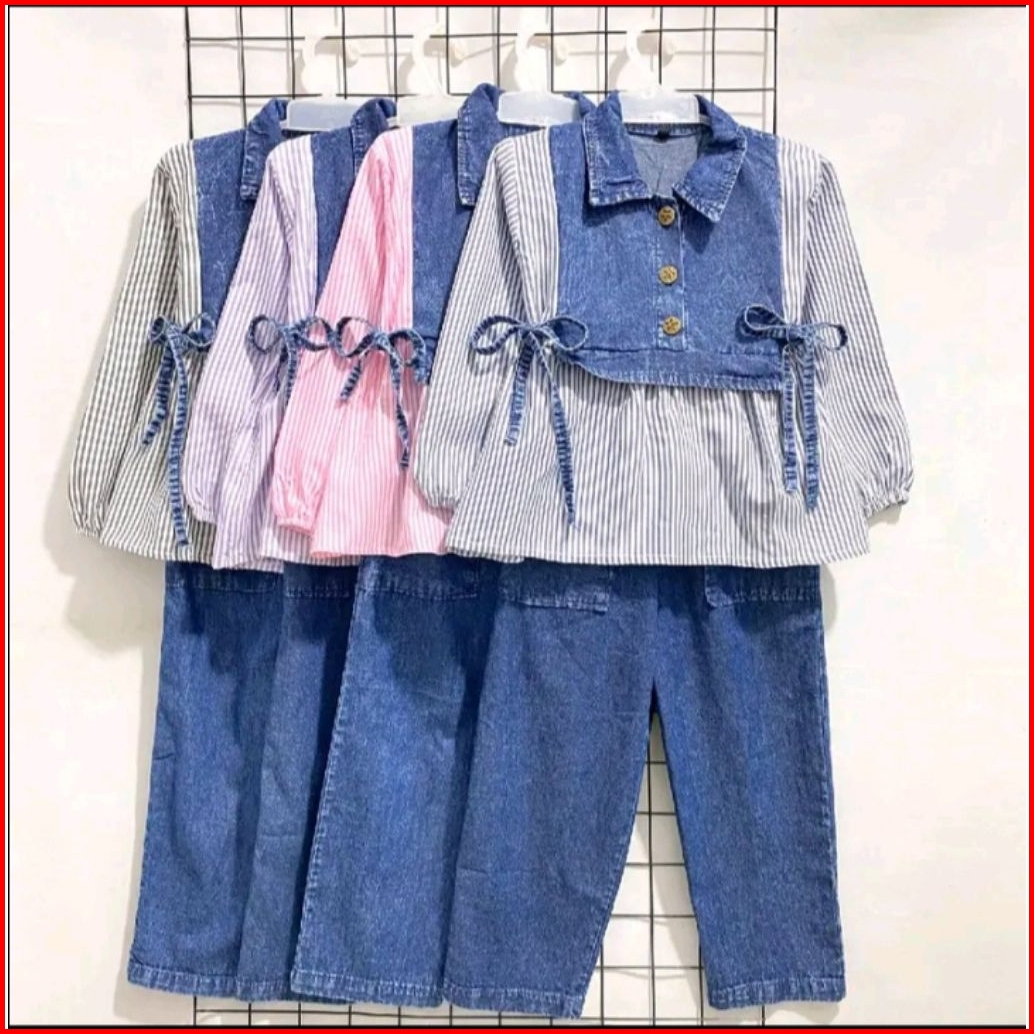Setelan Jeans Anak Aruna I Atasan Kemeja Motif Salur 2-11 Tahun I Oneset Jeans Anak Kekinian Fashion Anak