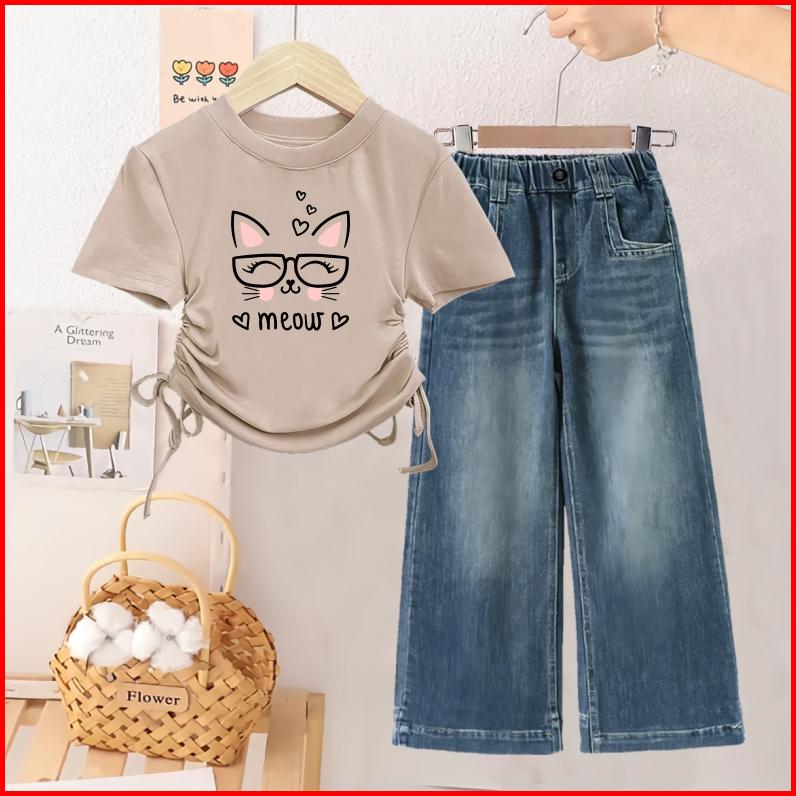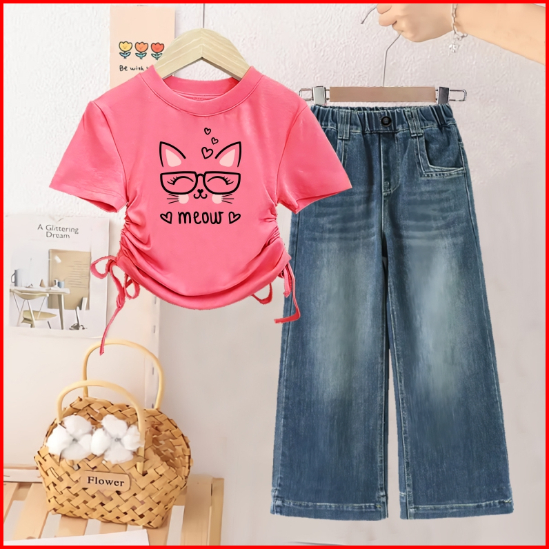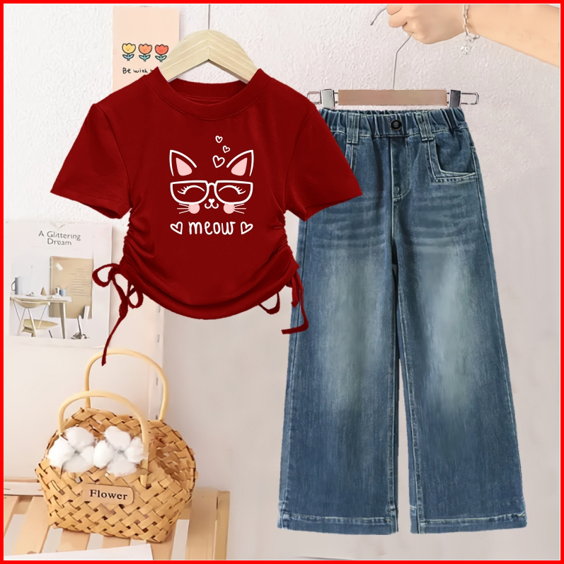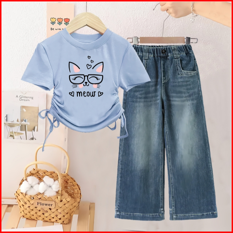 Setelan Kaos Anak Cewek Dan Celana Kulot Jeans Usia 1 - 12 Tahun
