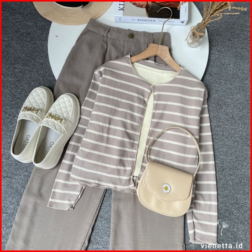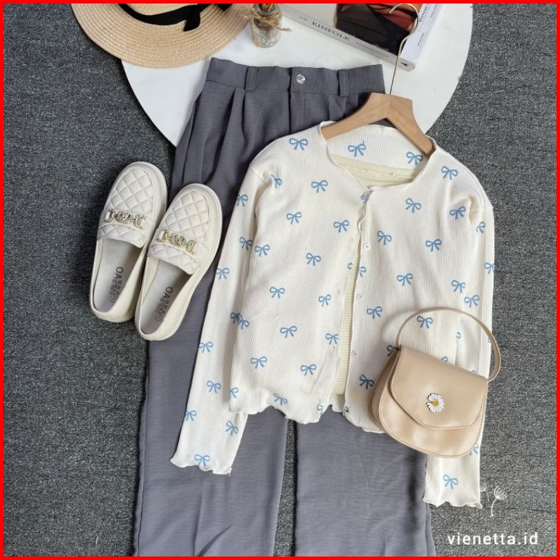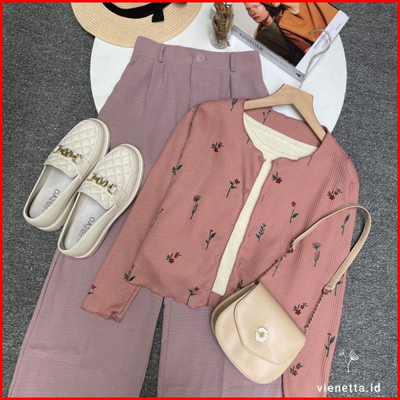 Vienetta Id - One Set Setelan Wanita Kekinian Cardi Rib Knit Bunga Kulot Crinkle Korean Style Lucu Buat Healing Piknik J