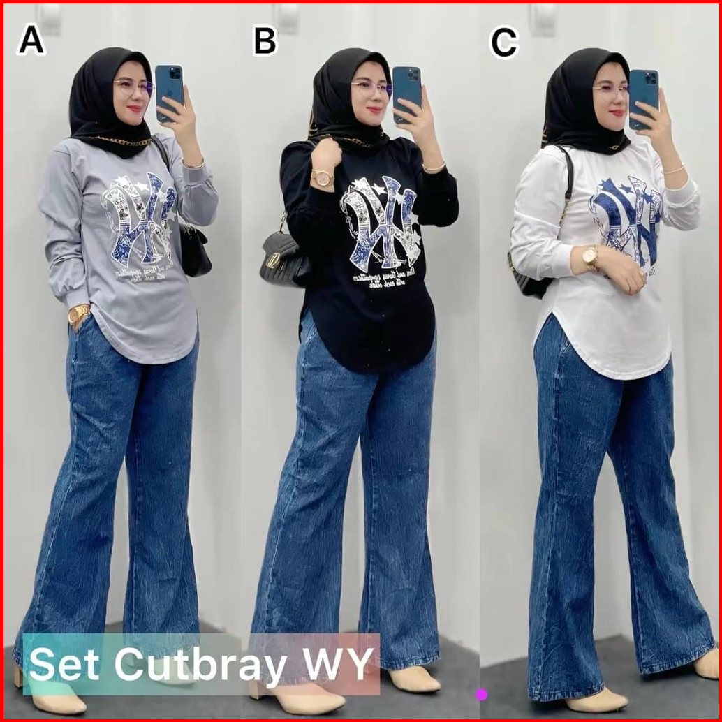 Setelan Wanita Terbaru Bahan Atasan Combed Mix Celana Cupray Jeans One Set Sablon Kekinian Nyc