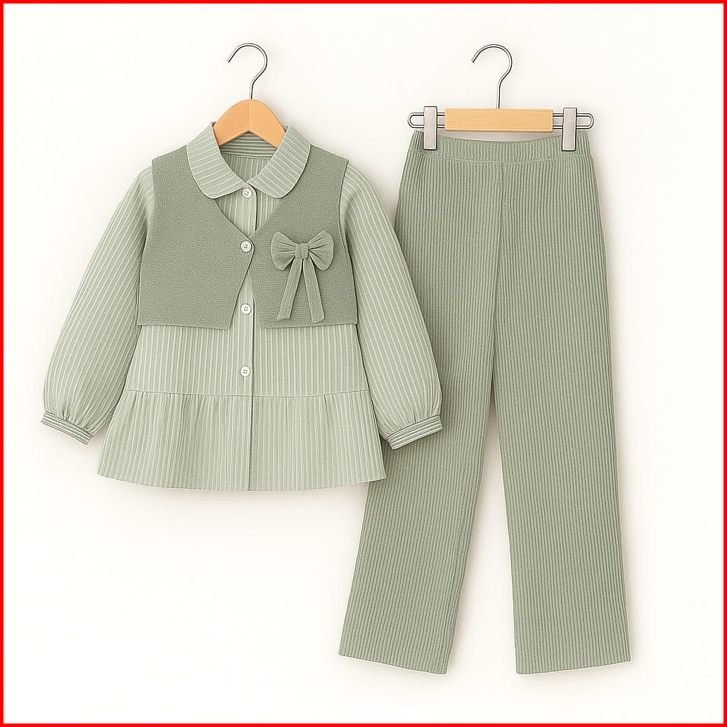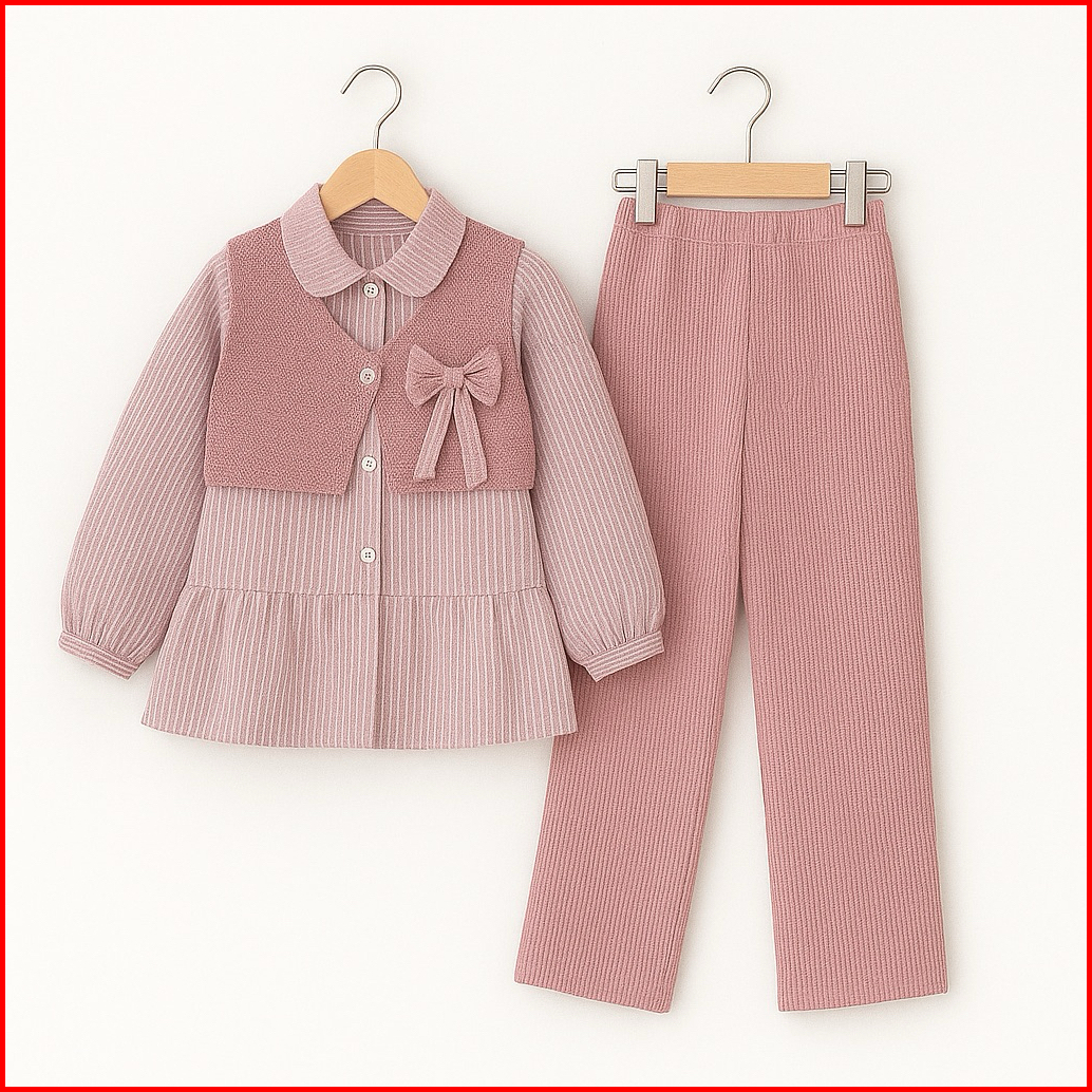 Setelan Anak Perempuan Terbaru 2025 Lengan Panjang Usia 4-15 Tahun Bahan Knit Mix Salur Terbaru Kekinian Fashion