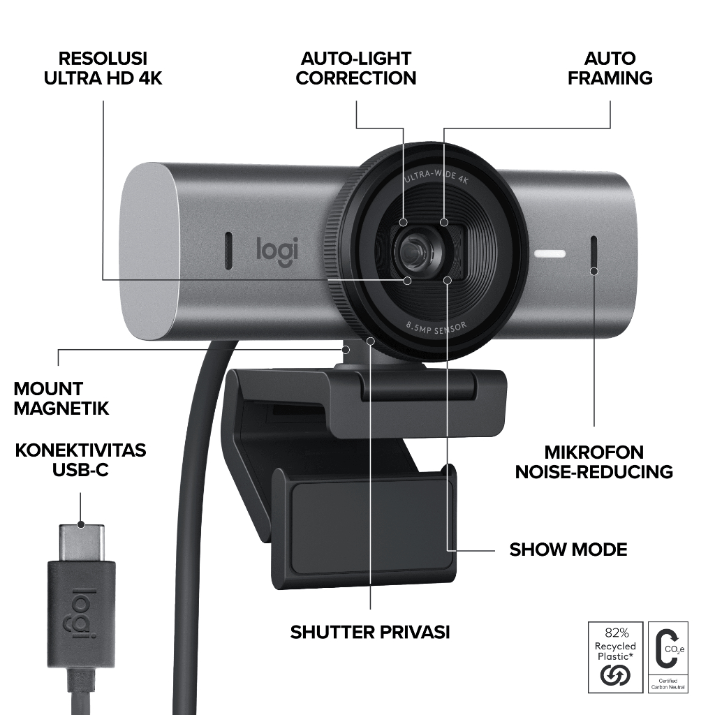 Logitech MX Brio Webcam Streaming & Kolaborasi dilengkapi dengan Ultra HD 4K, 1080p pada 60 FPS, Mikrofon Noise Reduction Ganda dan Show Mode