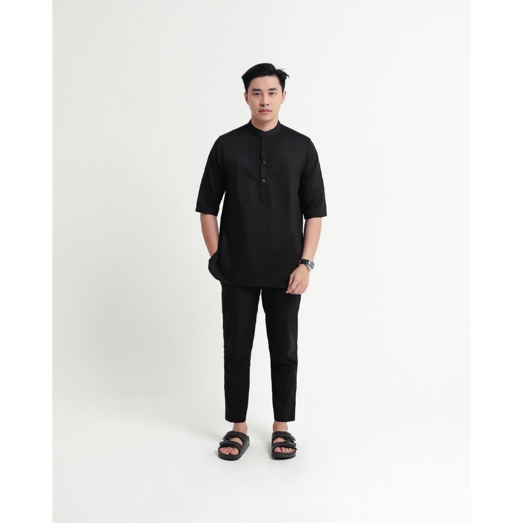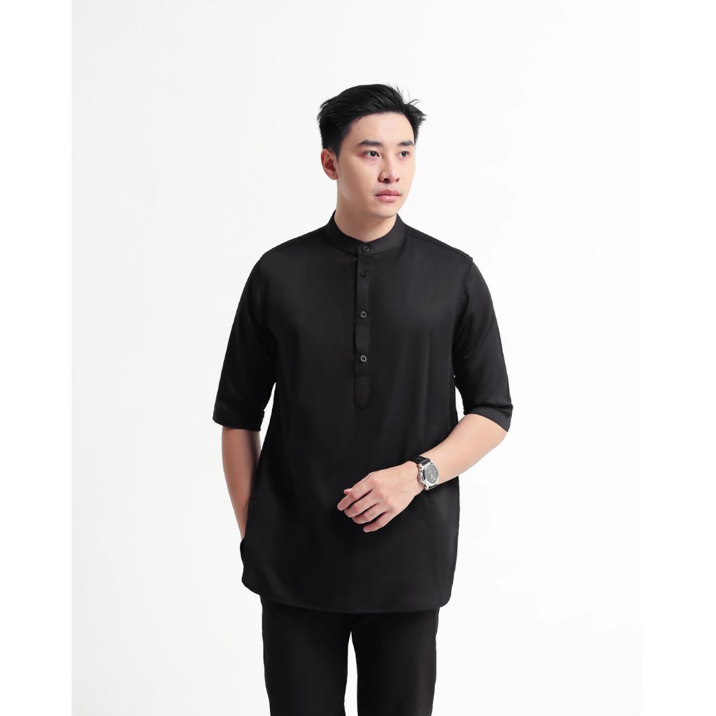 Broodis Kemeja Koko Kurta Pria Cotton Sateen Black Kerah Shanghai Lengan Panjang - Qudsy Black Series