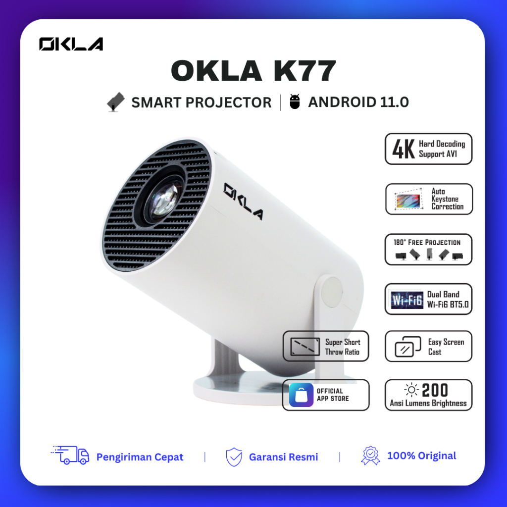 OKLA K77 SMART PROYEKTOR - GOOGLE STORE - PROJECTOR ANDROID 11 WIFI HDMI USB - 200 ANSI LUMENS 4K