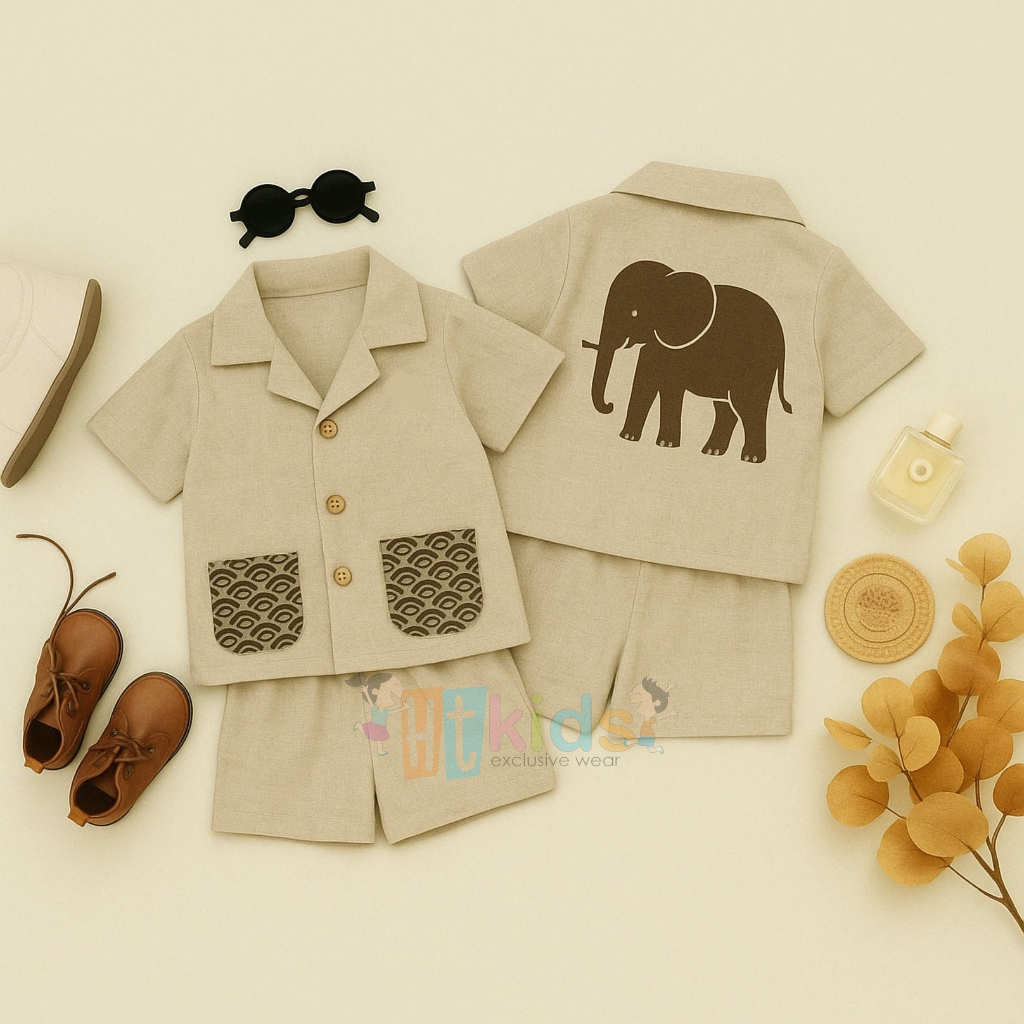 HTKIDS Baju Setelan Safari Anak – Motif Binatang Lucu (Zebra, Singa, Gajah, Buaya) ST14 1 - 6 Tahun