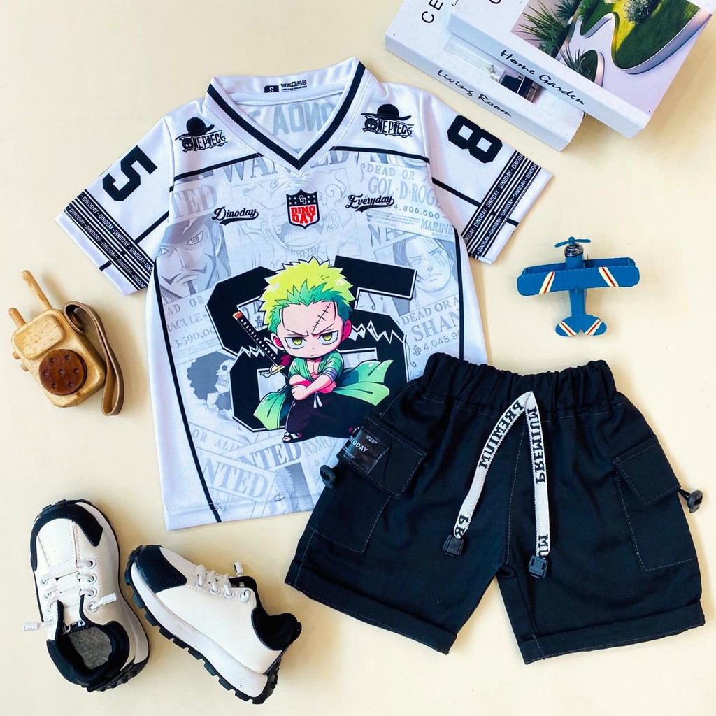 ESTISHOP X DINODAY Setelan Baju Anak Laki Kaos Jersey one Piece Luffy Celana Cargo Premnium Tahun