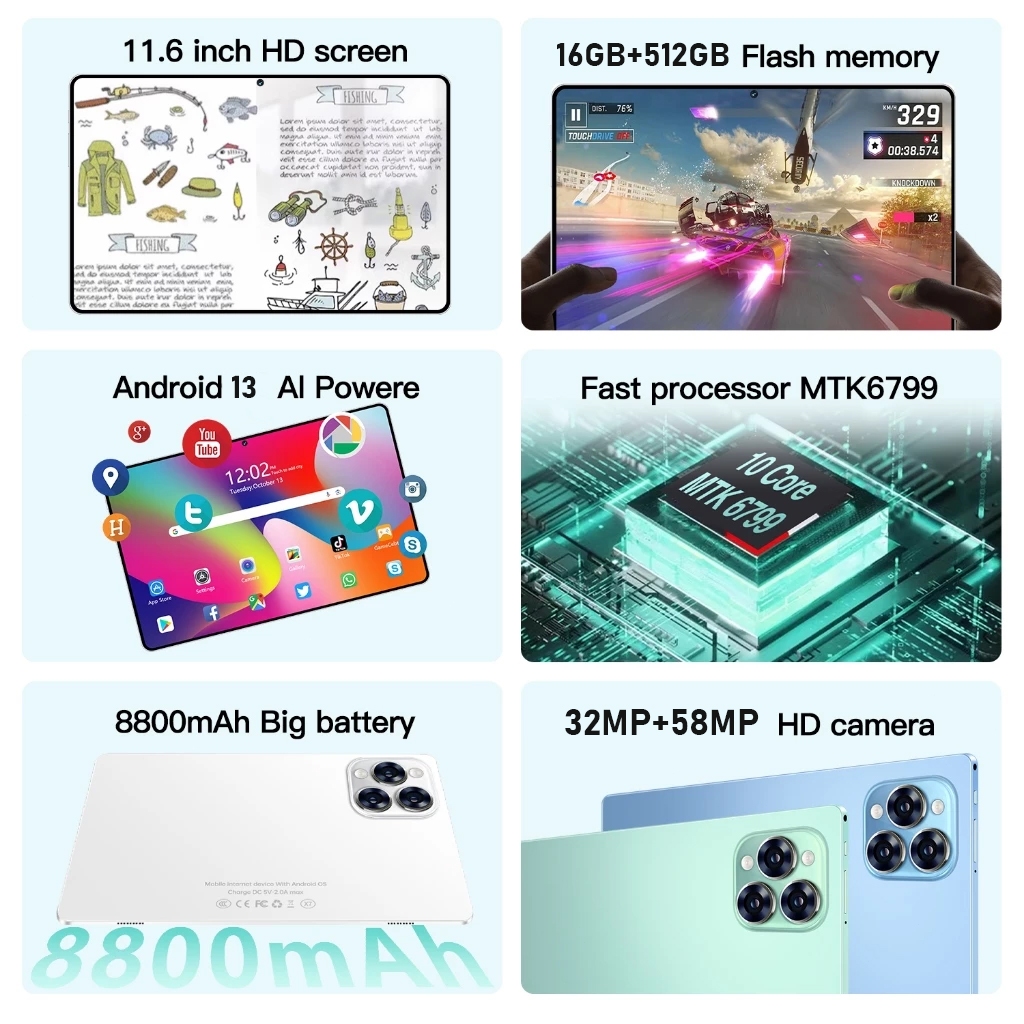 Tablet Baru 2025 Tablet Pro12 11.6" 16GB+512GB | 8800mAh | Kamera 58MP | 5G+WiFi+Dual SIM | Untuk Gaming & Belajar | IPS Full Screen | Android 13 | dukungan Tablet pelindung mata HD
