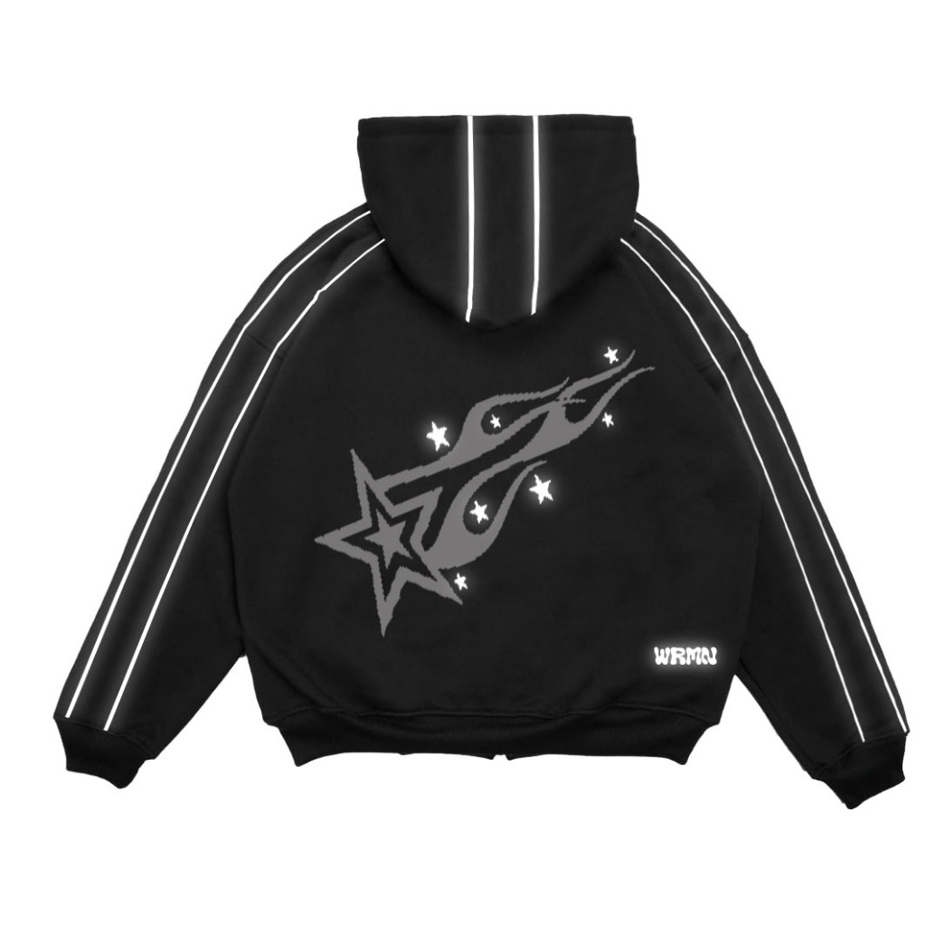 WRMN Double Zipper Boxy Reflektif Star Fire List Free Gift Hoodie Boxy Sablon Menyala Uni Pria Wanita