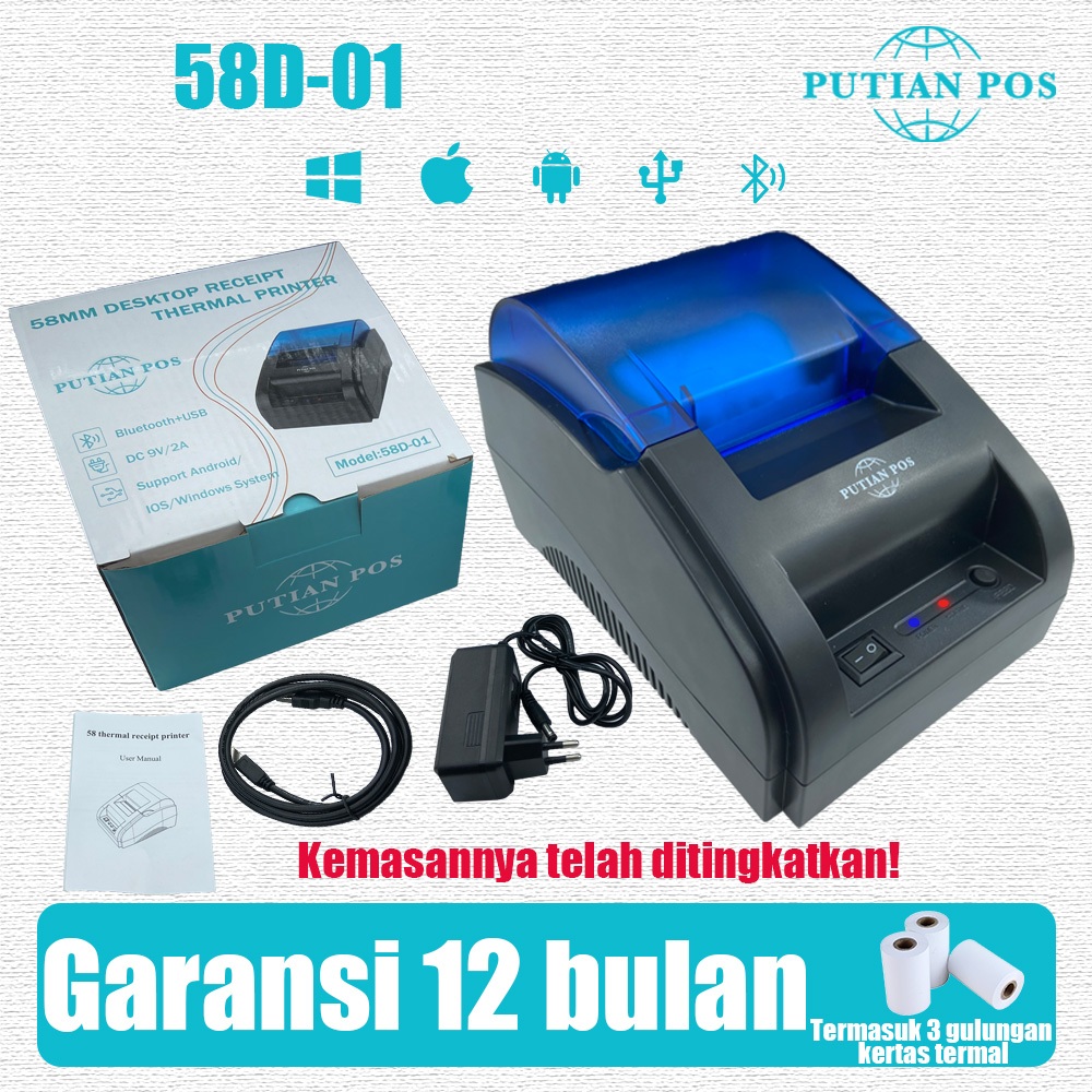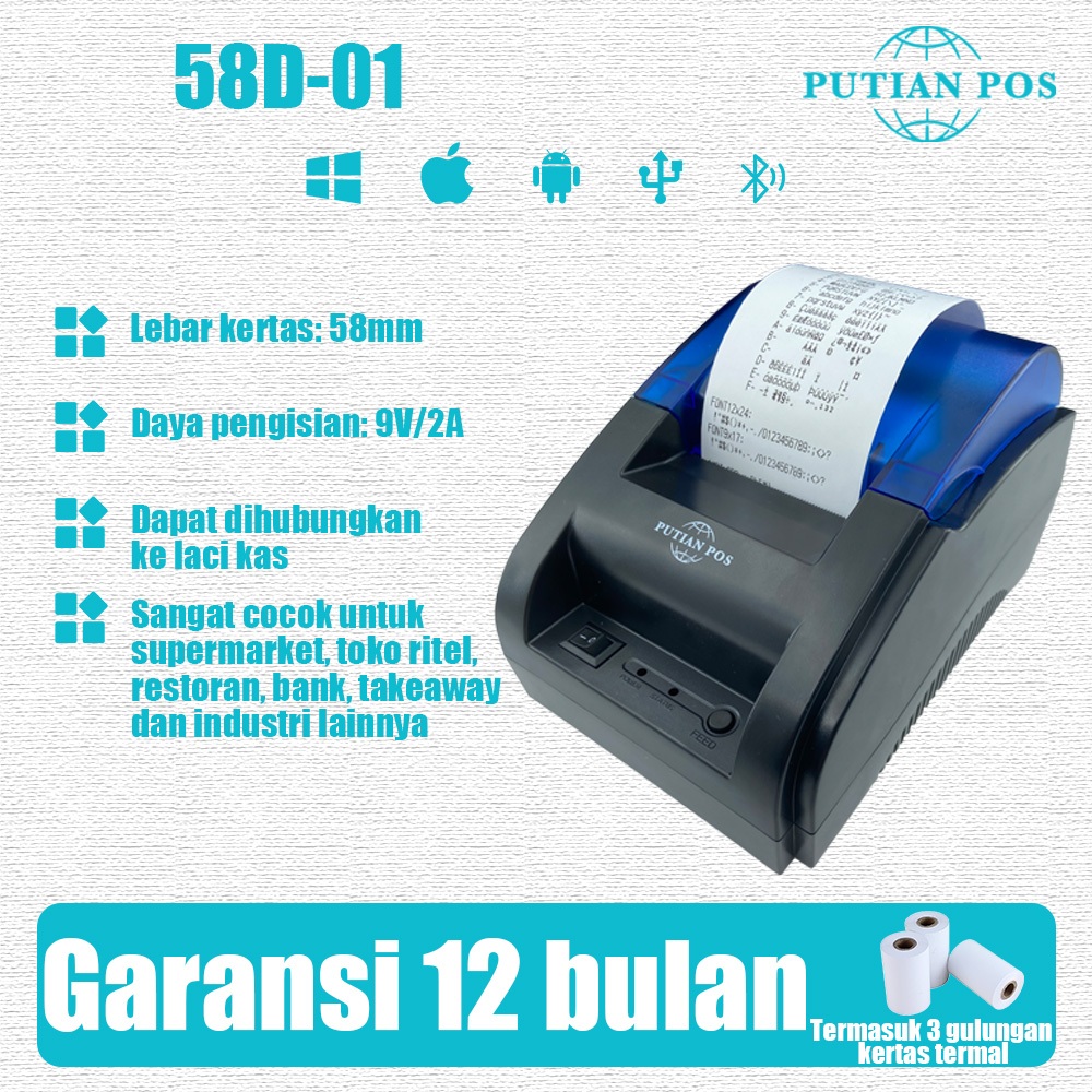 PUTIAN POS Printer Bluetooth Termal 58D-01 Kasir Printer Mini Portabel/Dukungan PPOB (Bluetooth+USB)