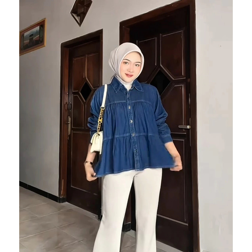 Atasan Wanita Kekinian Alea Blouse Jeans Ruffle Lengan Panjang Denim Shirt Flare Series Premium Best Seller Murah