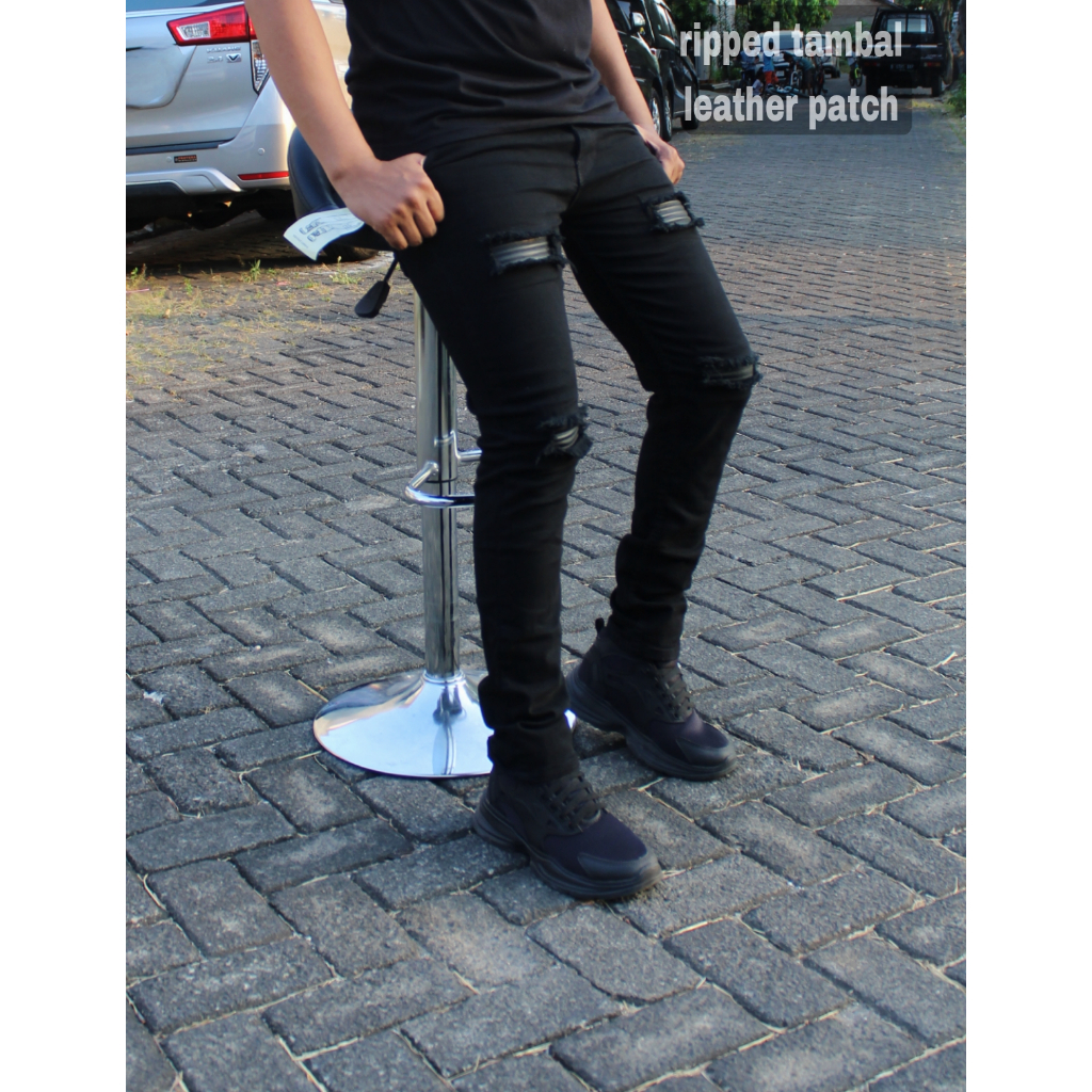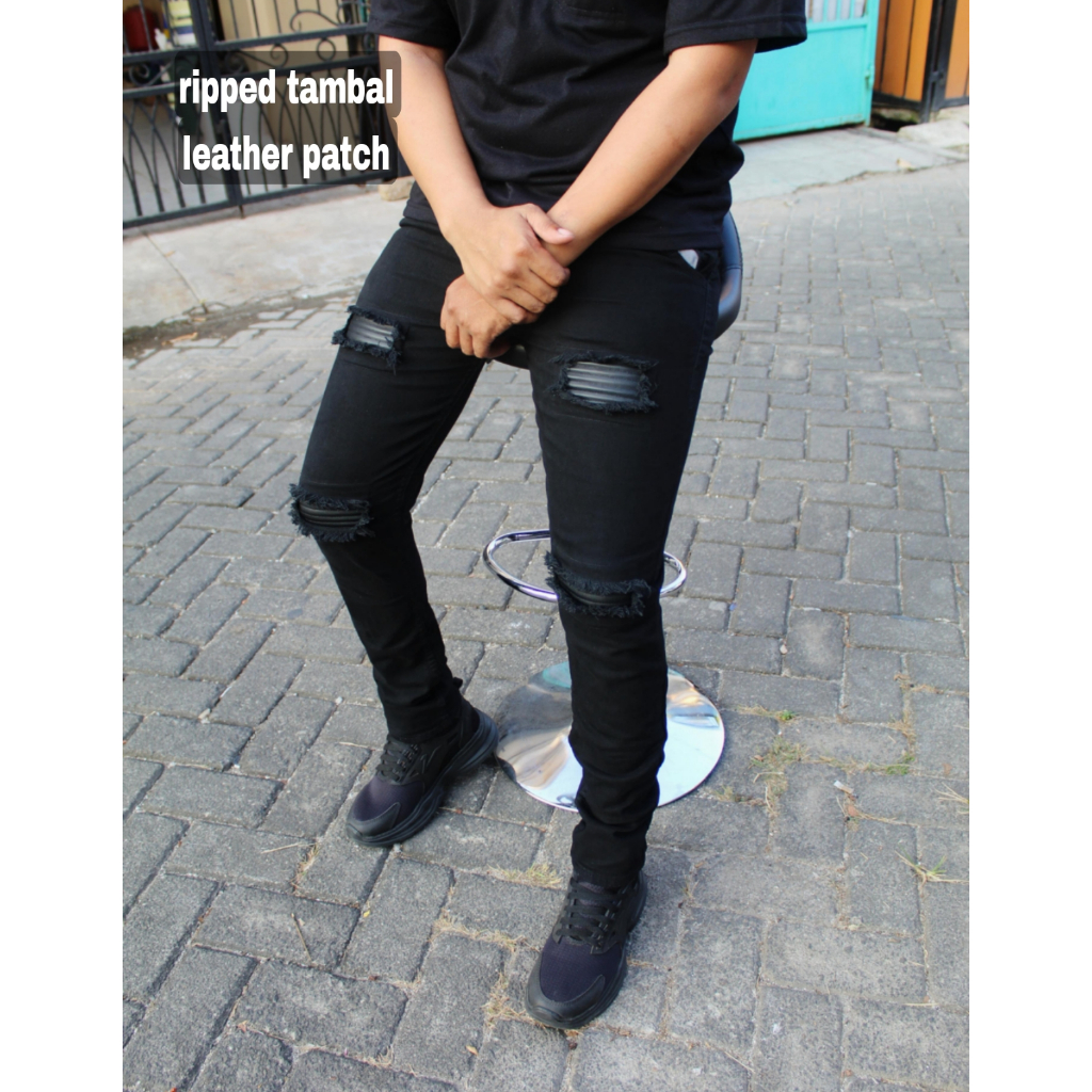 Celana sobek tambal Leather patch / Celana panjang jeans sobek pria pakai lapisan