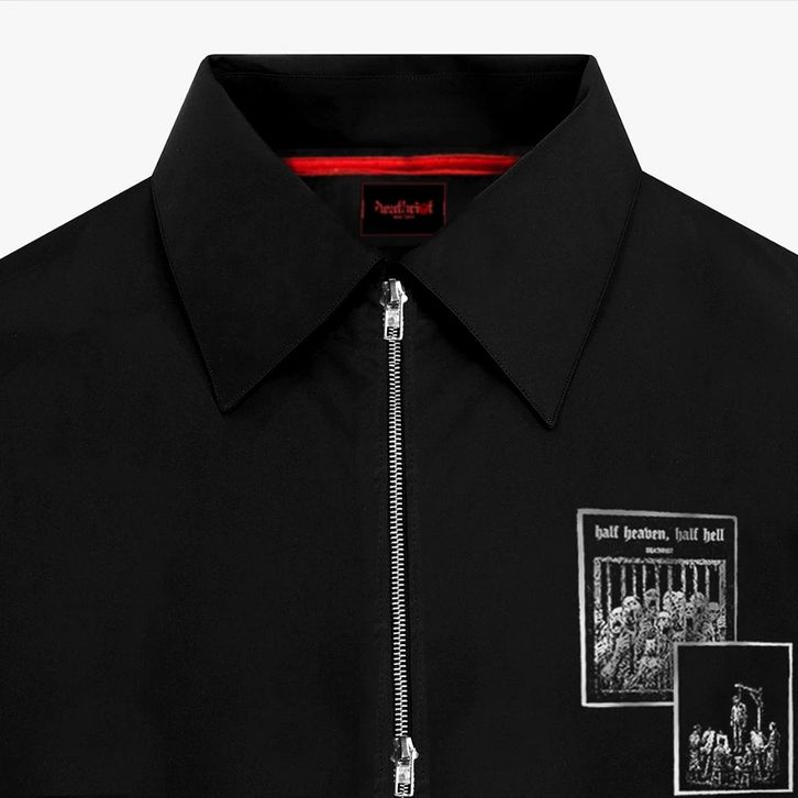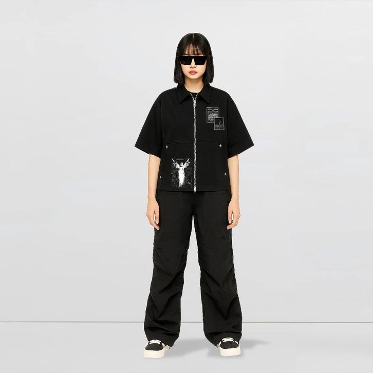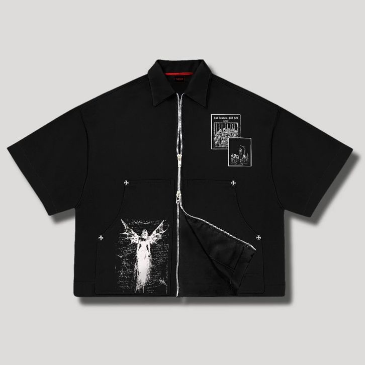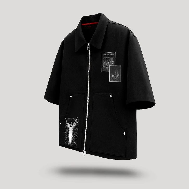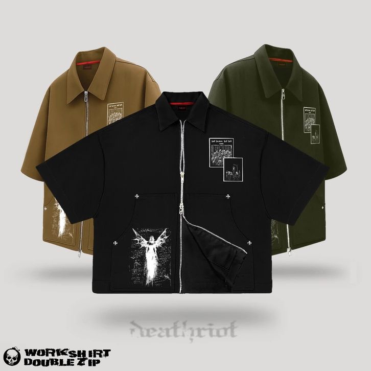 Workshirt Double Zipper Boxy Fit Kemeja Lengan Pendek Skena Pria Spike Unisex Atasan Pria Kekinian Kemeja Pria Dewasa