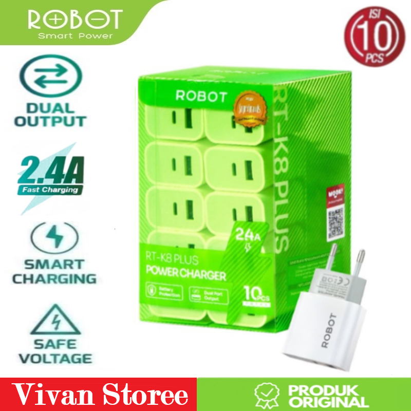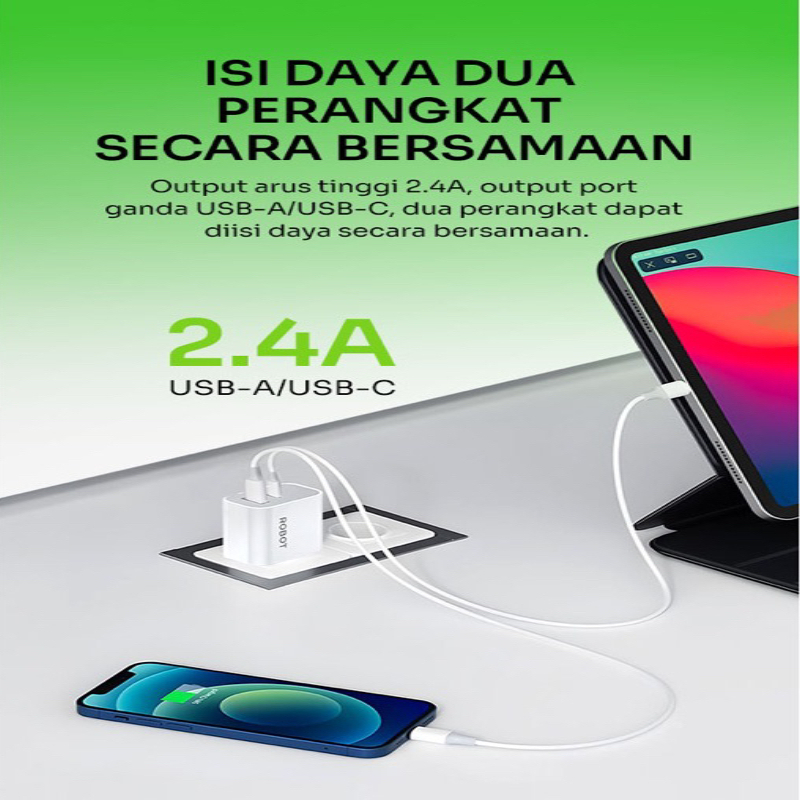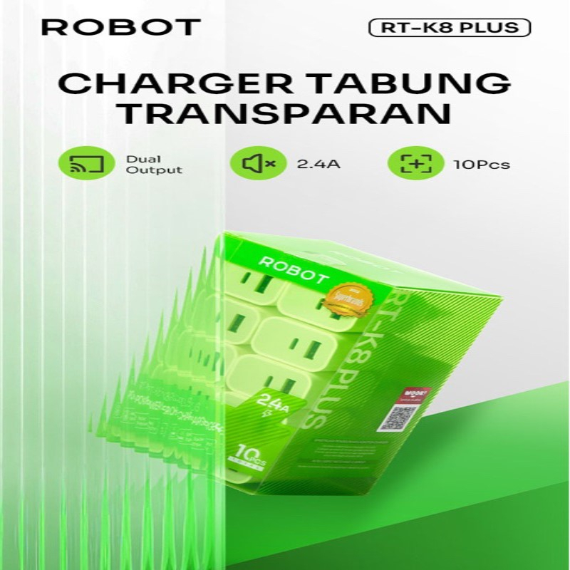 ROBOT Adaptor Charger RT-K8 PLUS 1 Box 10 PCS Batok Charger 2.4A Dual Output USB-A + USB-C Garansi Original Resmi