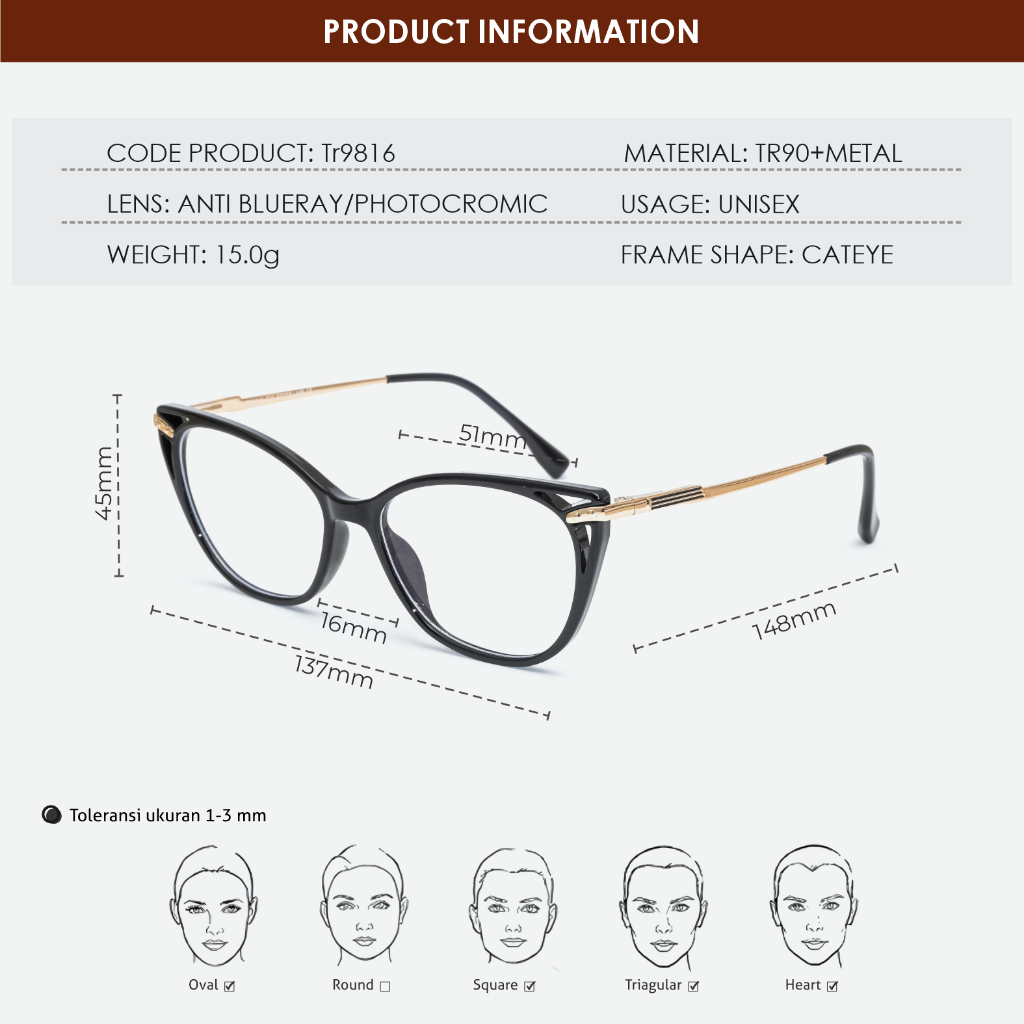 Colore.in Kacamata Photocromic Anti Blueray Lensa Minus Kacamata Fashion Terbaru Wanita TR-90+Metal TR9816