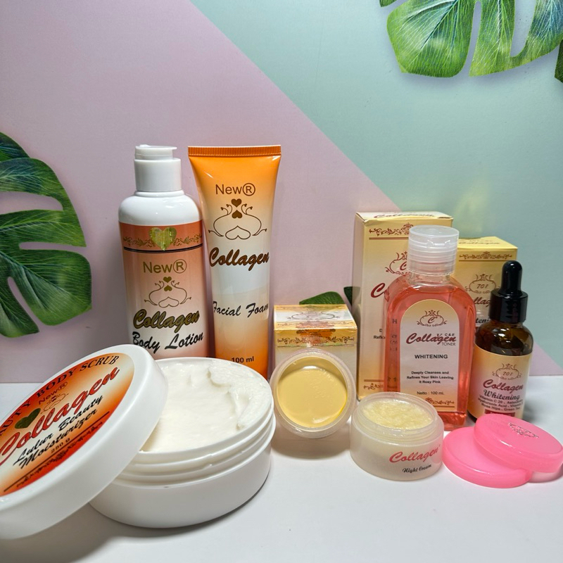 Termurah Paket lengkap perawatan wajah dan tubuh collagen 7in1 ( cream siang, malam, fal foam, toner, serum, lotion, body scrub )