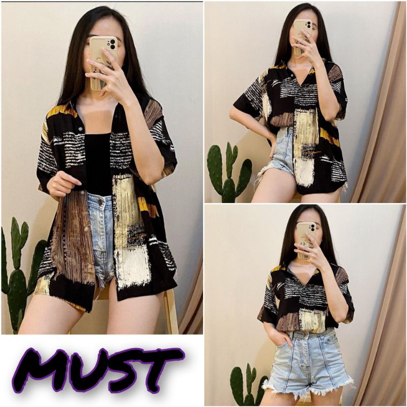 MUST Kemeja Hawaiian Pria Wanita Motif Abstrak Printing Vintage Casual Shirt Lengan Pendek Retro