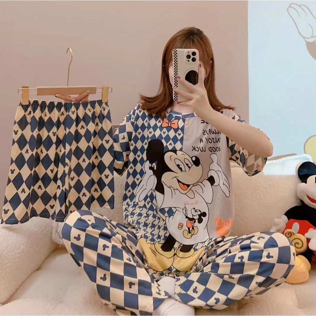 Yooyi Baju Tidur Wanita 3 In 1 Piyama Setelan Perempuan Dewasa Lengan Pendek Celana Panjang dan Celana Pendek Remaja 010