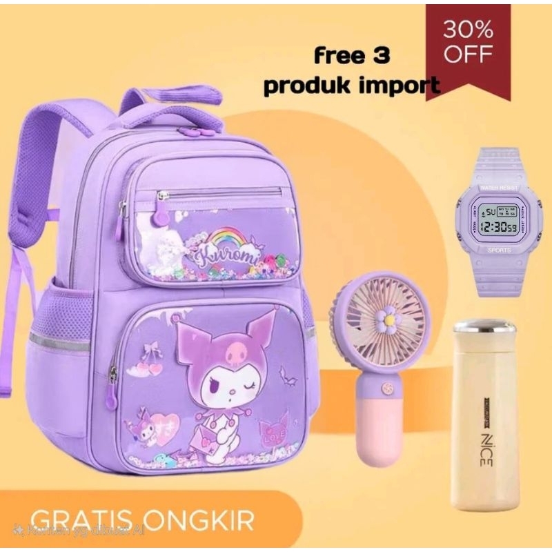 Tas Sekolah Anak Perempuan Karakter Kuromi Mika Gratis Kipas Portable Botol Minum Dan Jam Tangan