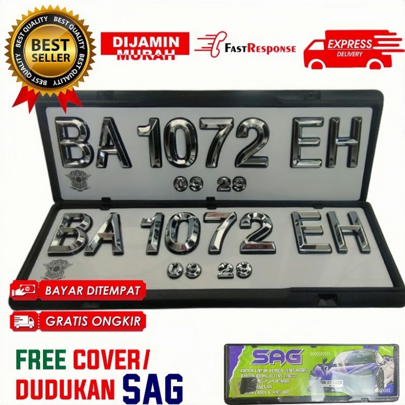 Plat Nomor Mobil Mewah Putih List Hitam Krom lancip 7cm Segi 5 FREE COVER