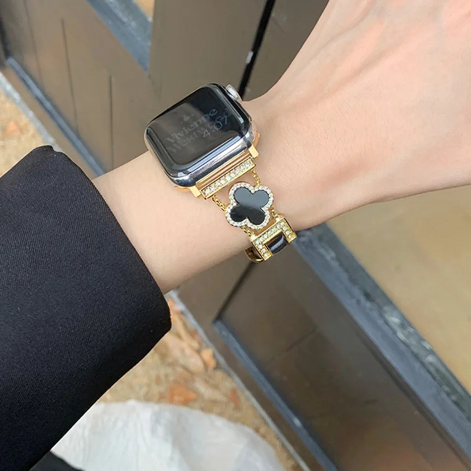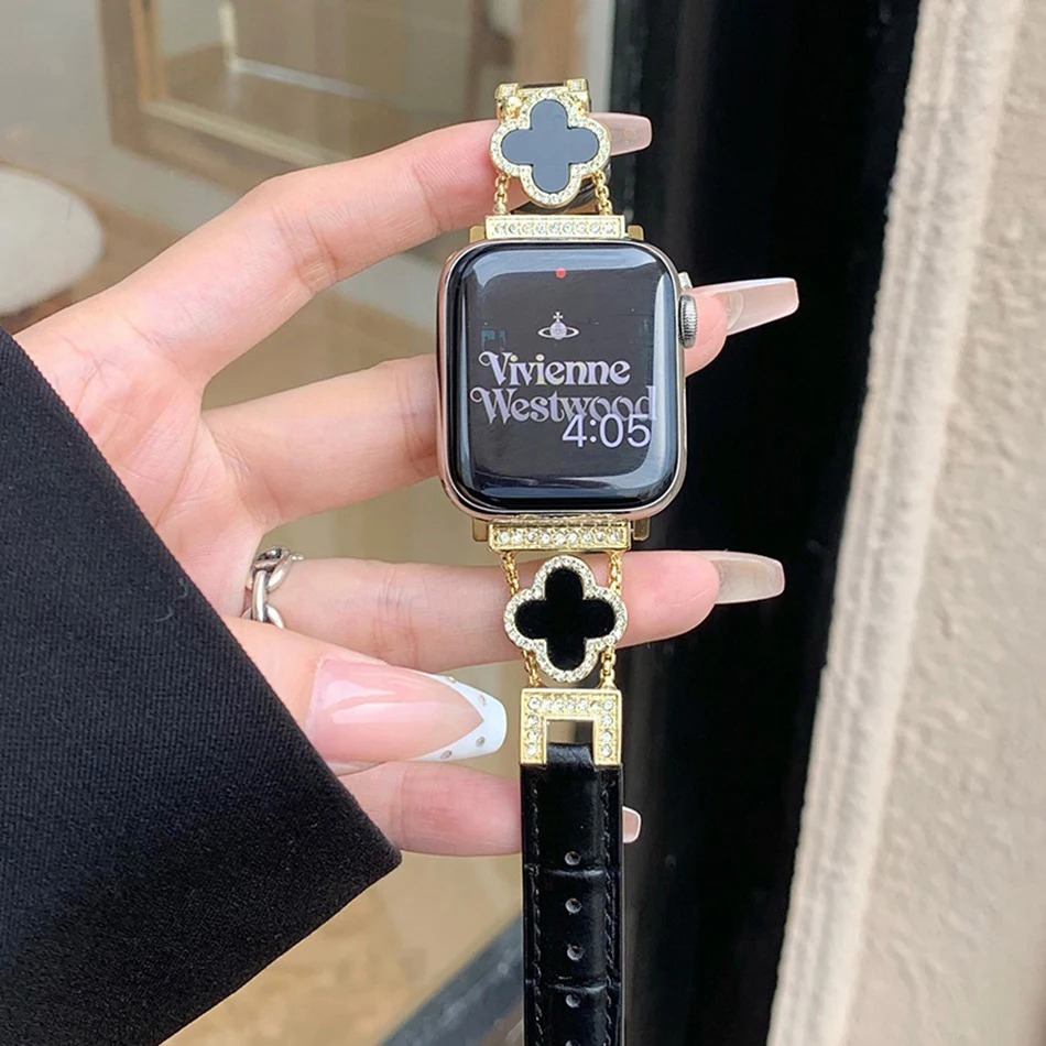 Leather Strap For Apple Watch Series 11 10 9 8 7 6 SE3 5 4 3 46/45/44/42/41/40/38mm Luxury Diamond Flower Bracelet For I