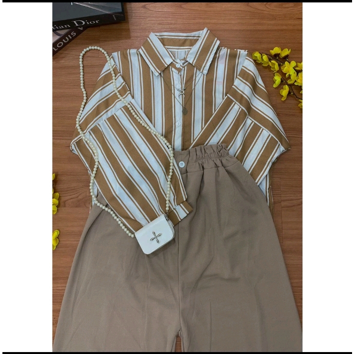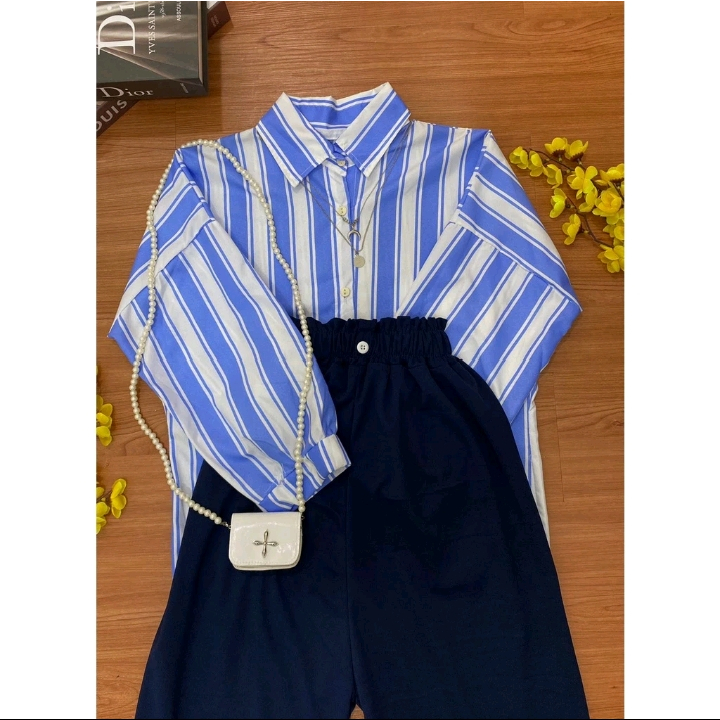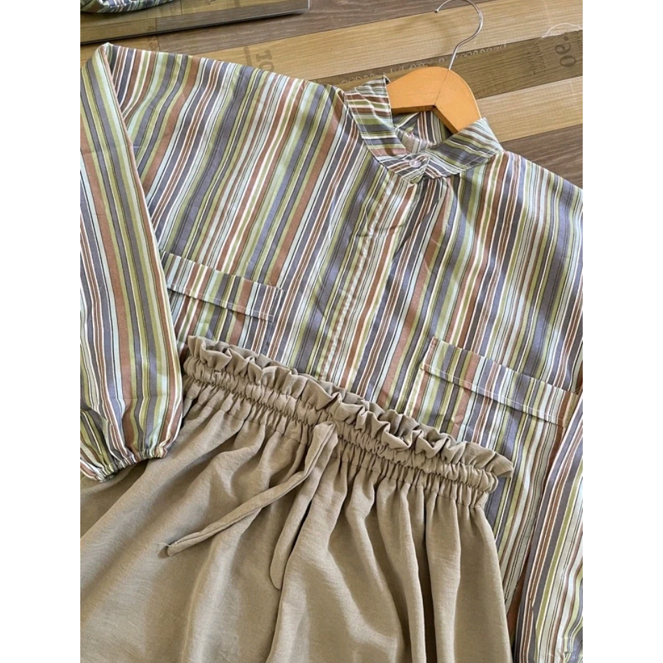Woow Murah Banget One Set Salur Kemeja Oversize / Set Aprilia Candy Sierra Stripe Wanita