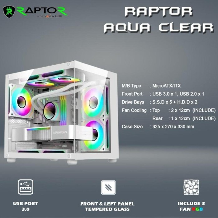 Casing PC Raptor Aqua Clear M-ATX Include 3 Fan