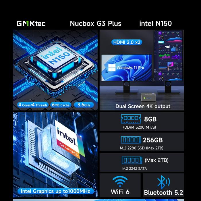 MINI PC OFFICE GMKTEC INTEL TWIN LAKE N150 8GB RAM 256GB SSD NVME 4K DISPLAY WIN 11 PRO GARANSI 1 TAHUN - BAREBONE (NO R