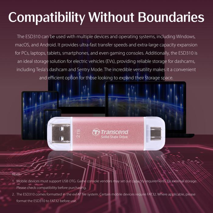 TRANSCEND ESD310 EXTERNAL SSD USB 3.2 GEN 2X1 (USB 10GBPS) [C-BLACK / S-SILVER / P-PINK] - HITAM, 256GB