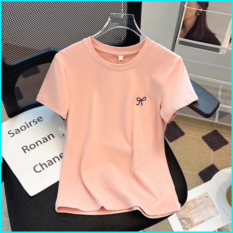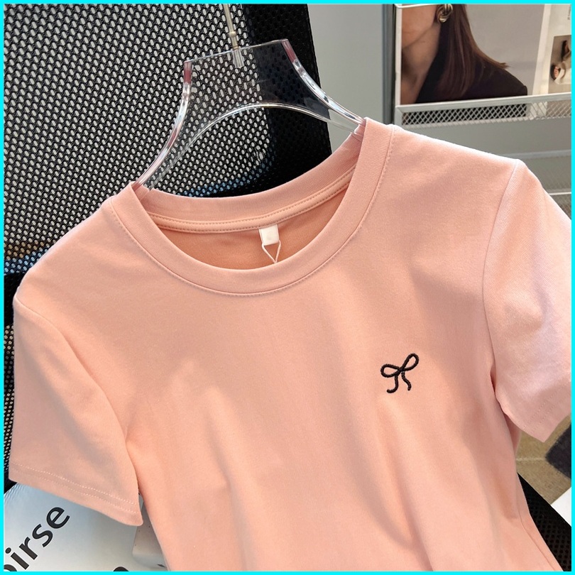 Kaus Leher Bulat Bordir Katun Murni Merah Muda Terbaru Atasan Seksi Fashion Wanita Gaya Korea
