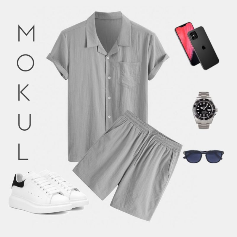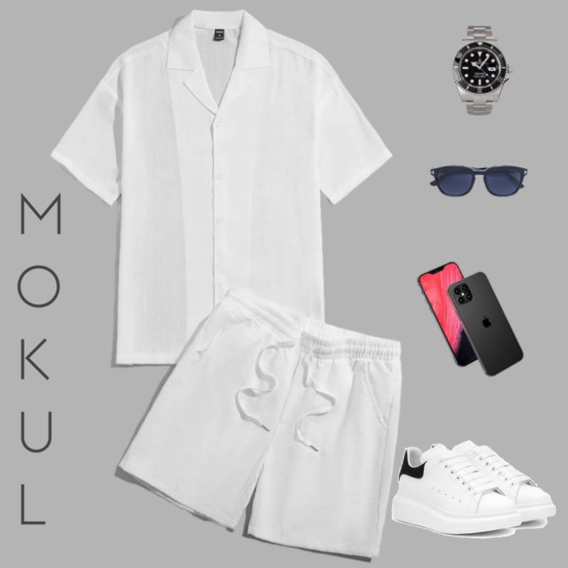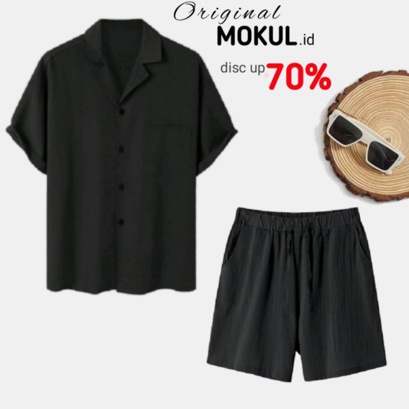 Kemeja Oneset Pria Wanita Korean Style Satu Setel Kemeja + Celana Hawai & Pantai Free Kalung Mutiara Stylish