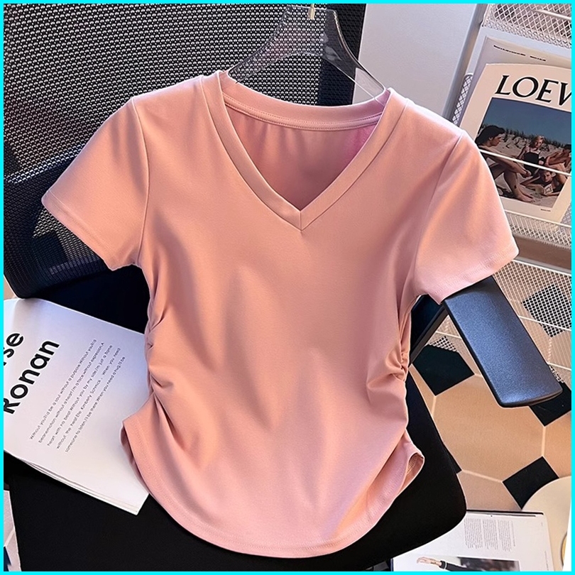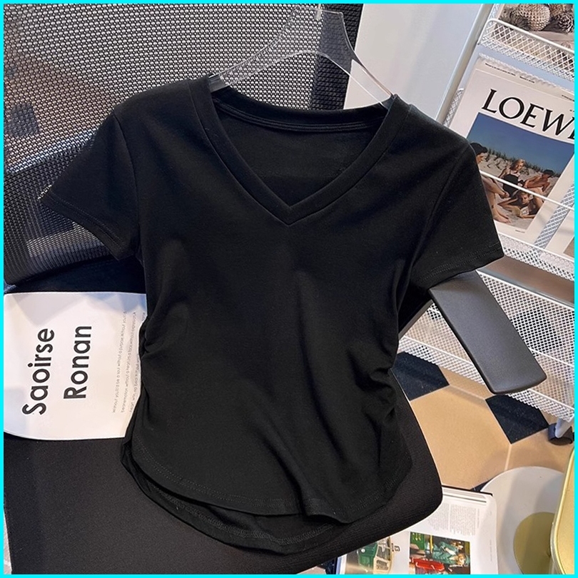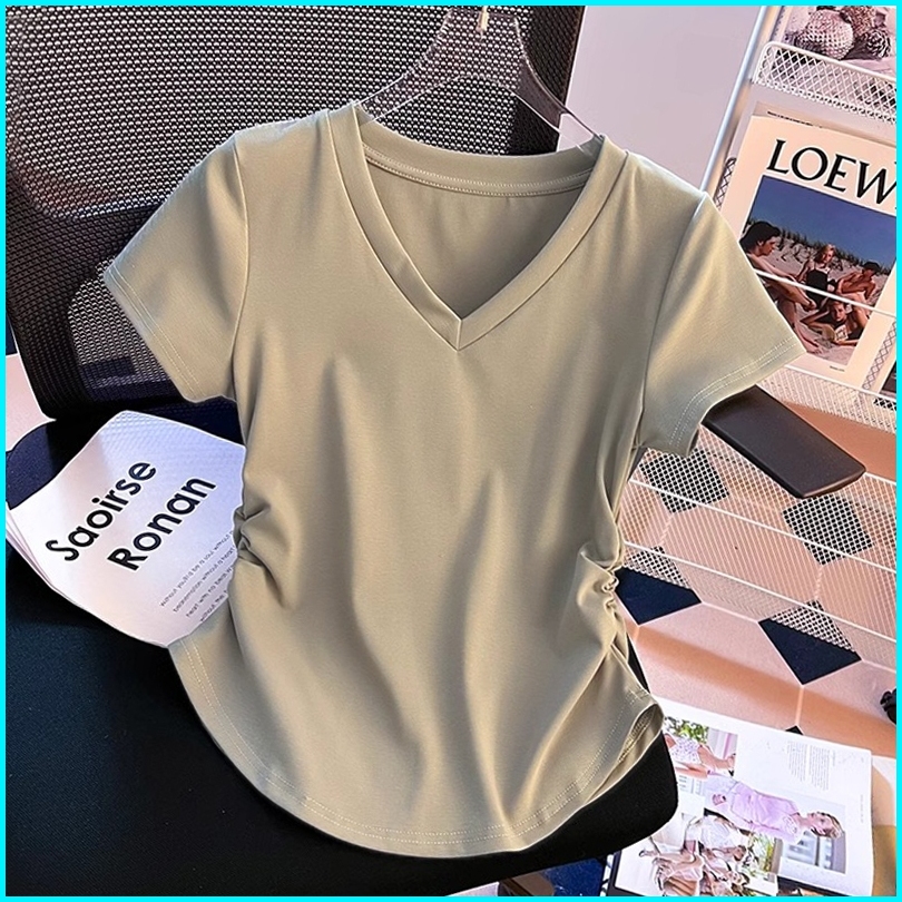 Kaus V-neck Bergaris Coklat Retro Kaus Ketat Pendek Gaya Korea Atasan Wanita Baru