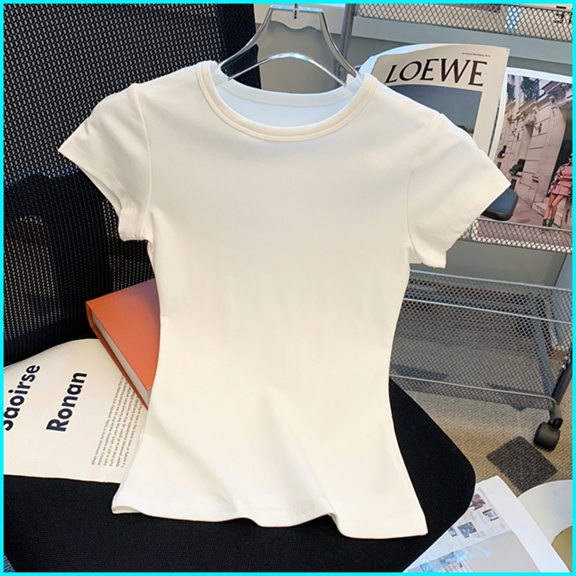 Kaus Pendek Leher Bulat Bergaris Warna Polos Atasan Kaus Ketat Elastis Seksi Fashion Wanita Gaya Korea