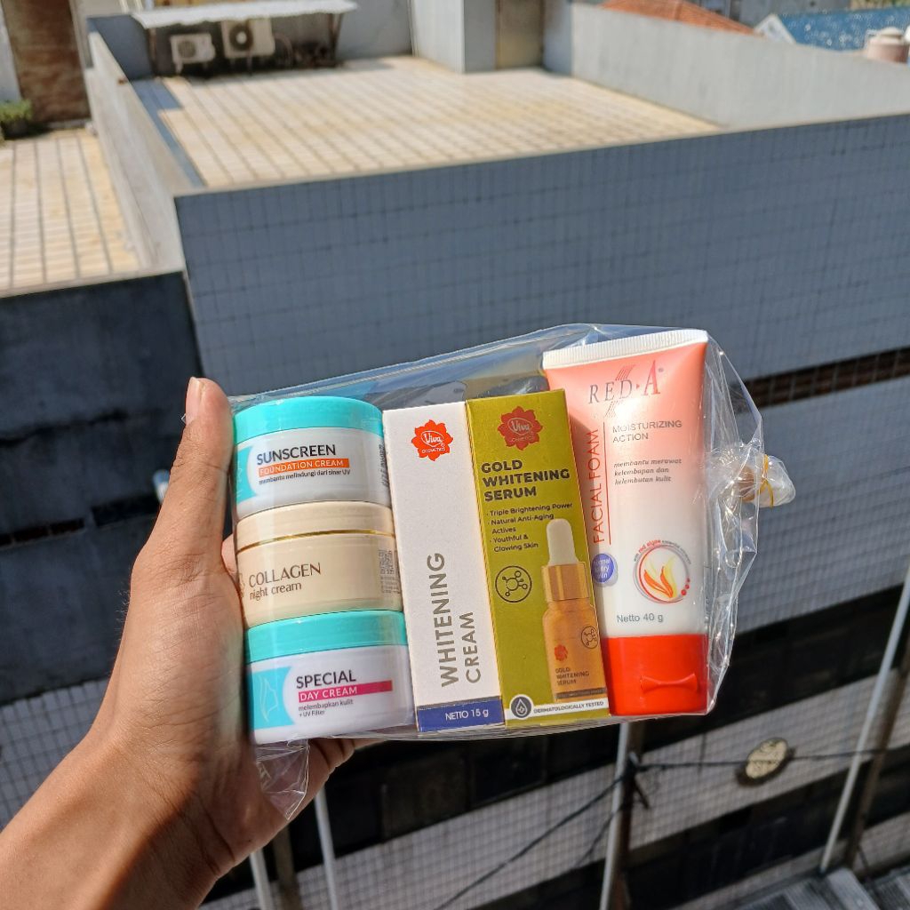 Paket Set Kecantikan Viva Cosmetik 6in1 BPOM [ Cream siang , malam. Sunscreen , Serum Viva , Whitening Cream , Fal Foam Red A ]