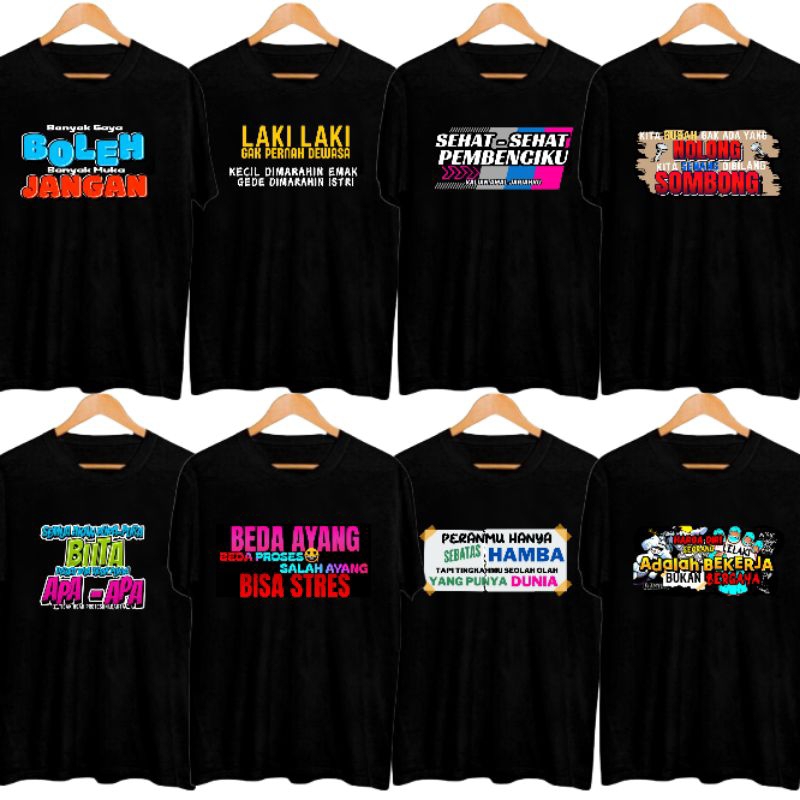 Paket Distro Kaos Kata 100ribu Dapat 8 Baju Sablon DTF - Semi Combed - Keren, Oblong, Tulisan motif Baru Pria Wanita Lengan Pendek Hitam