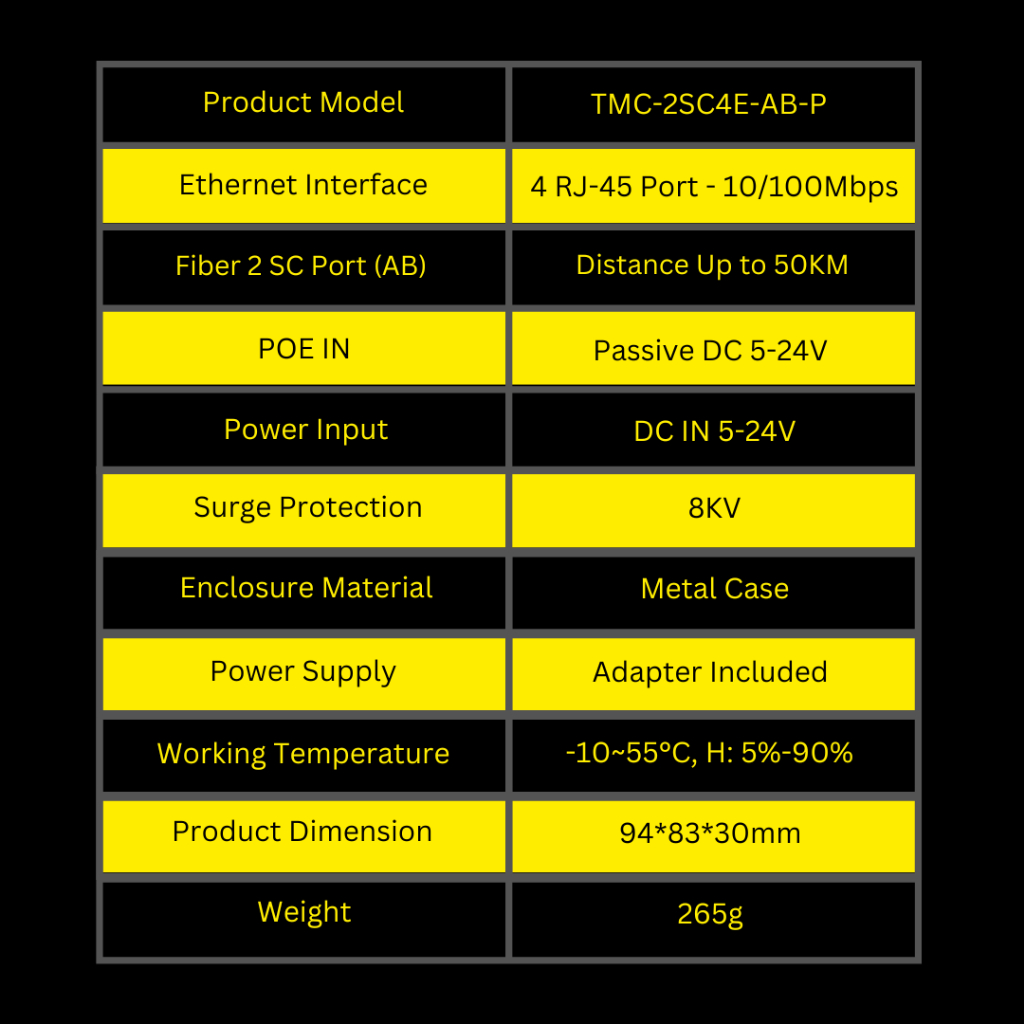 Tarmoc TMC-2SC4E-AB-P | Media Converter Switch 2 FO 4 LAN 10/100Mbps POE IN 5-24V