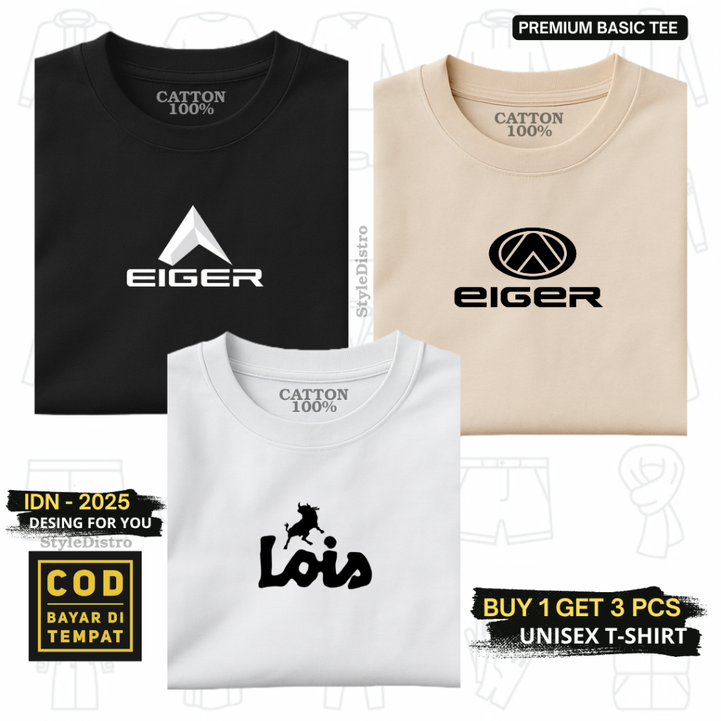 BUY 1 GET 3 PCS - Kaos Distro Pria Wanita T-Shirt Lengan Pendek - EIG A Putih - EIG O Hitam - LOIS Hitam