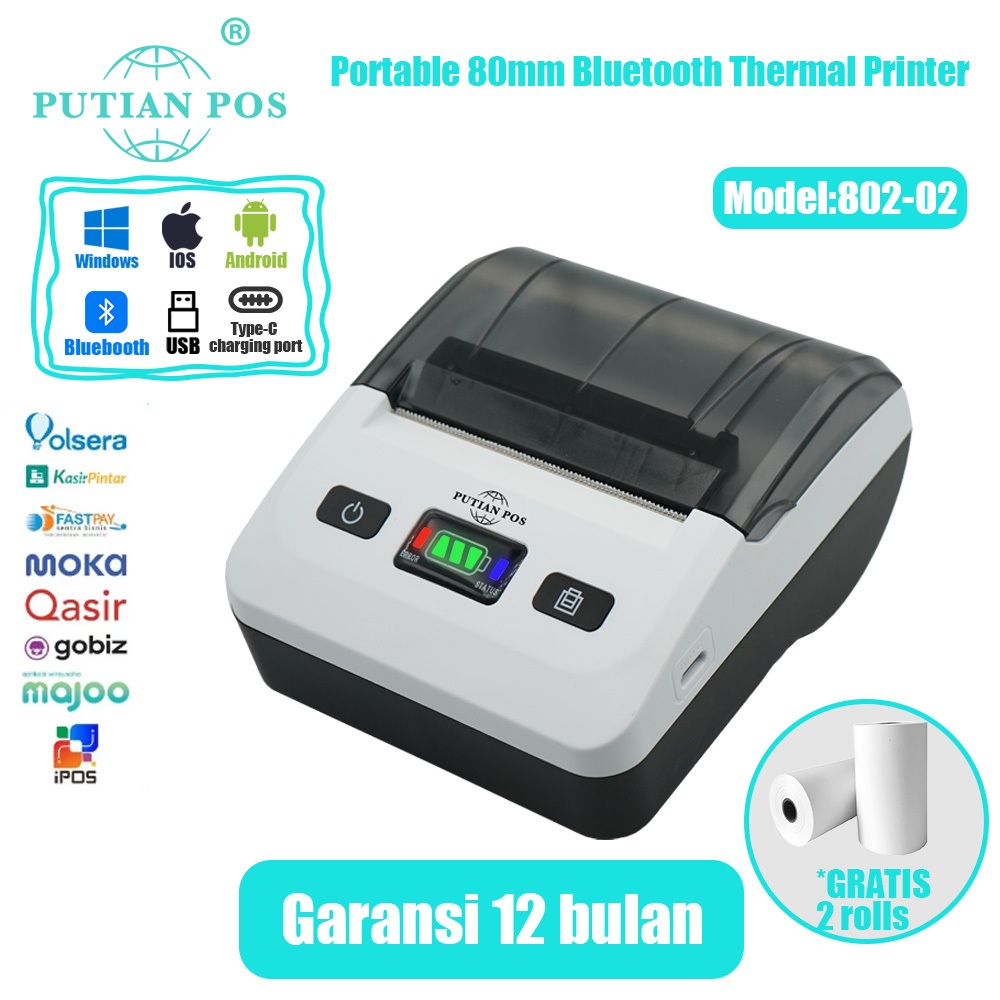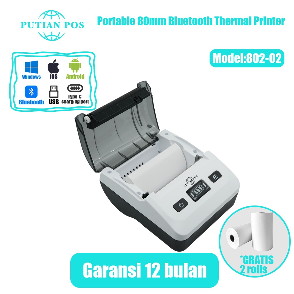 Printer Termal Bluetooth Portabel PUTIAN POS 80mm 802-02 untuk Toko Online (Dengan Baterai)