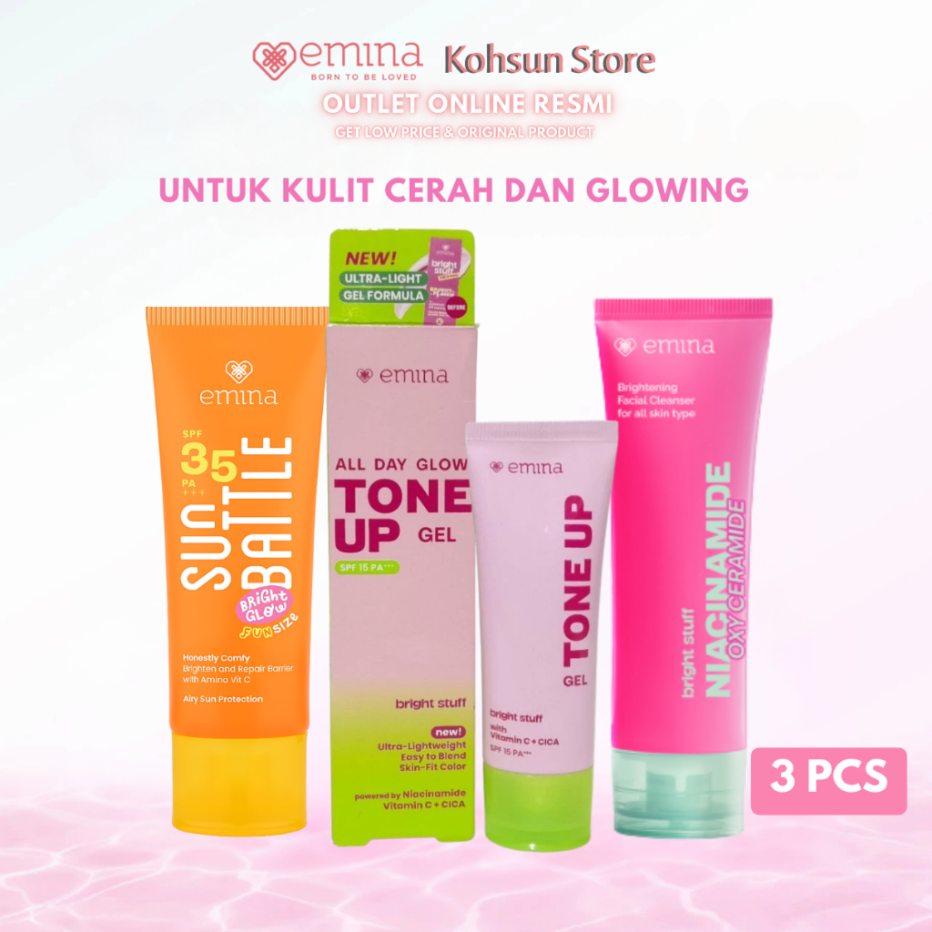 [PAKET GLOWING] EMINA 3in1 - Face Wash 50ml - Sun Battle Bright Sunscreen 20ml & Bright Stuff Tone Up 20ml