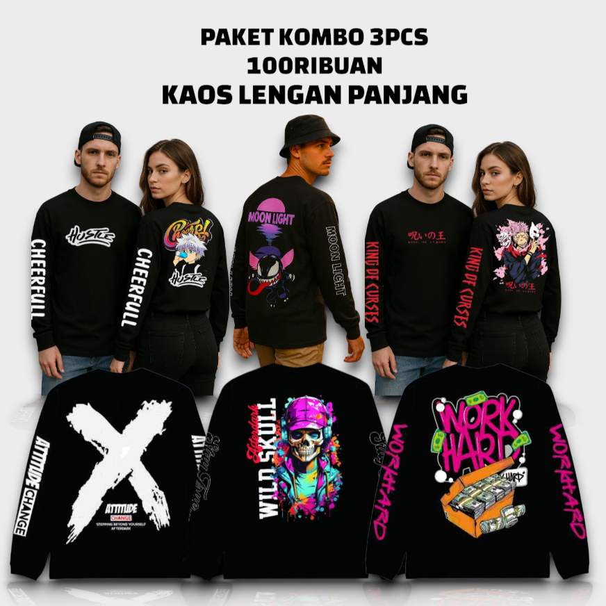 PAKET KOMBO 3PCS 1OORB KAOS LENGAN PANJANG /KAOS T-SHIRT PRIA MOTIF /KAOS DISTRO VIRAL TERPOPULER