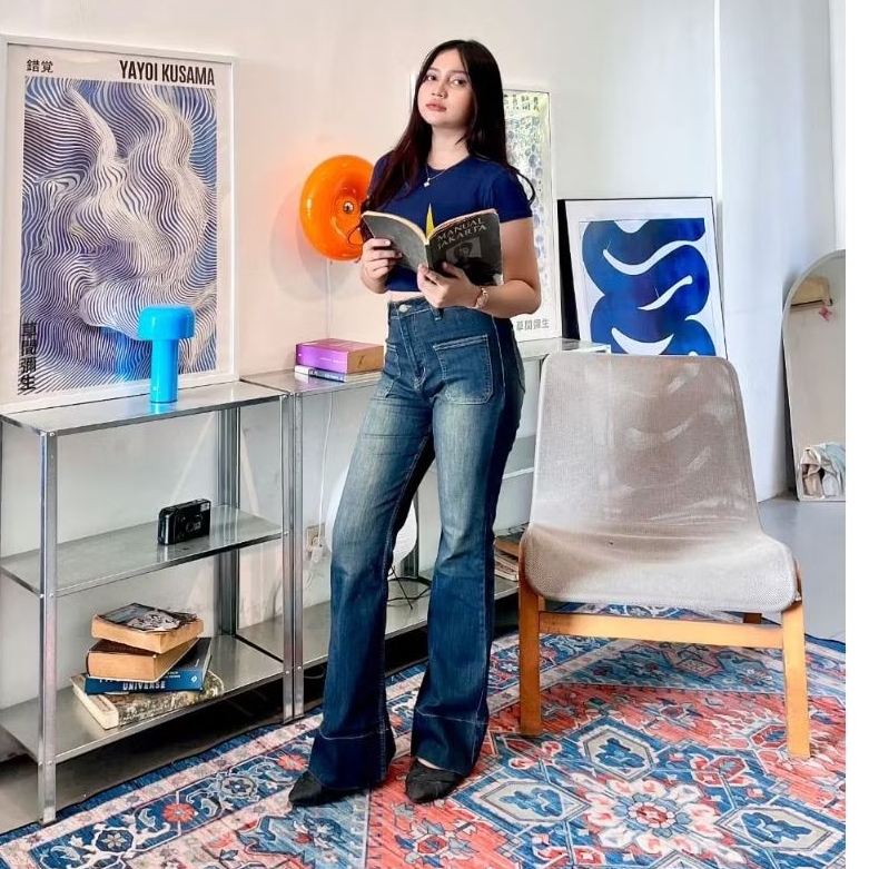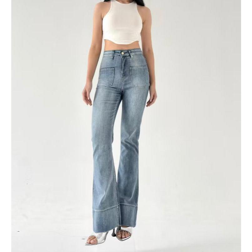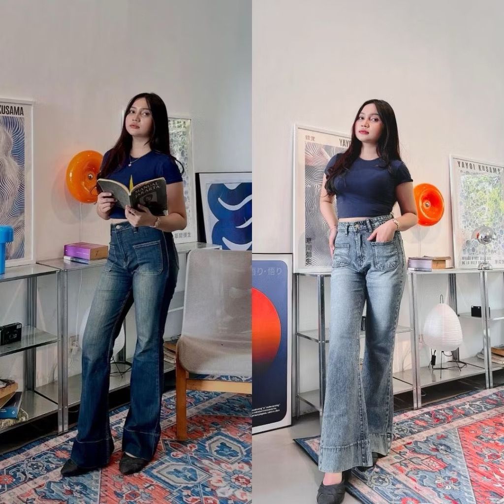 Highwaist Cutbray Jeans Celana Flare Panjang Stretch Wanita Retro Vintage Lipat Bawah