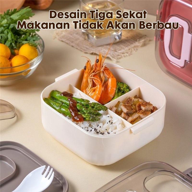 LUNCH BOX MICROWAVE SAFE 950ML KOTAK MAKAN SIANG 3 GRID ANTI TUMPAH TAHAN PANAS FREE SENDOK BEKAL ANAK SEKOLAH