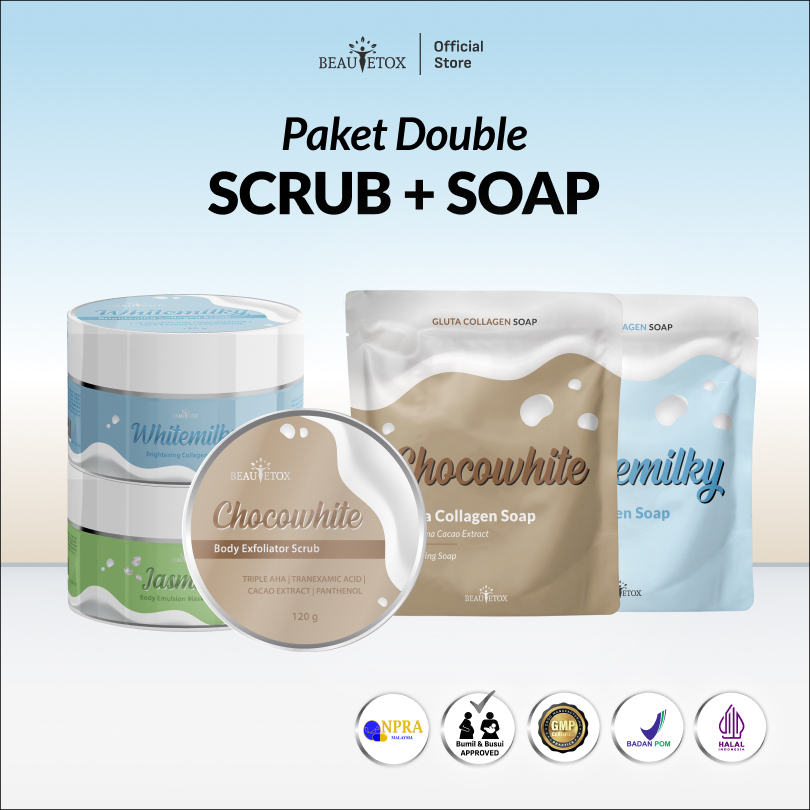 BEAUTETOX Paket 2 IN 1 Face and Body Brightening Package Paket Sabun dan Scrub Pemutih Wajah dan Badan BPOM Halal Chocowhite Whitemilky Jasmine Lulur Whitening Brightening Soap