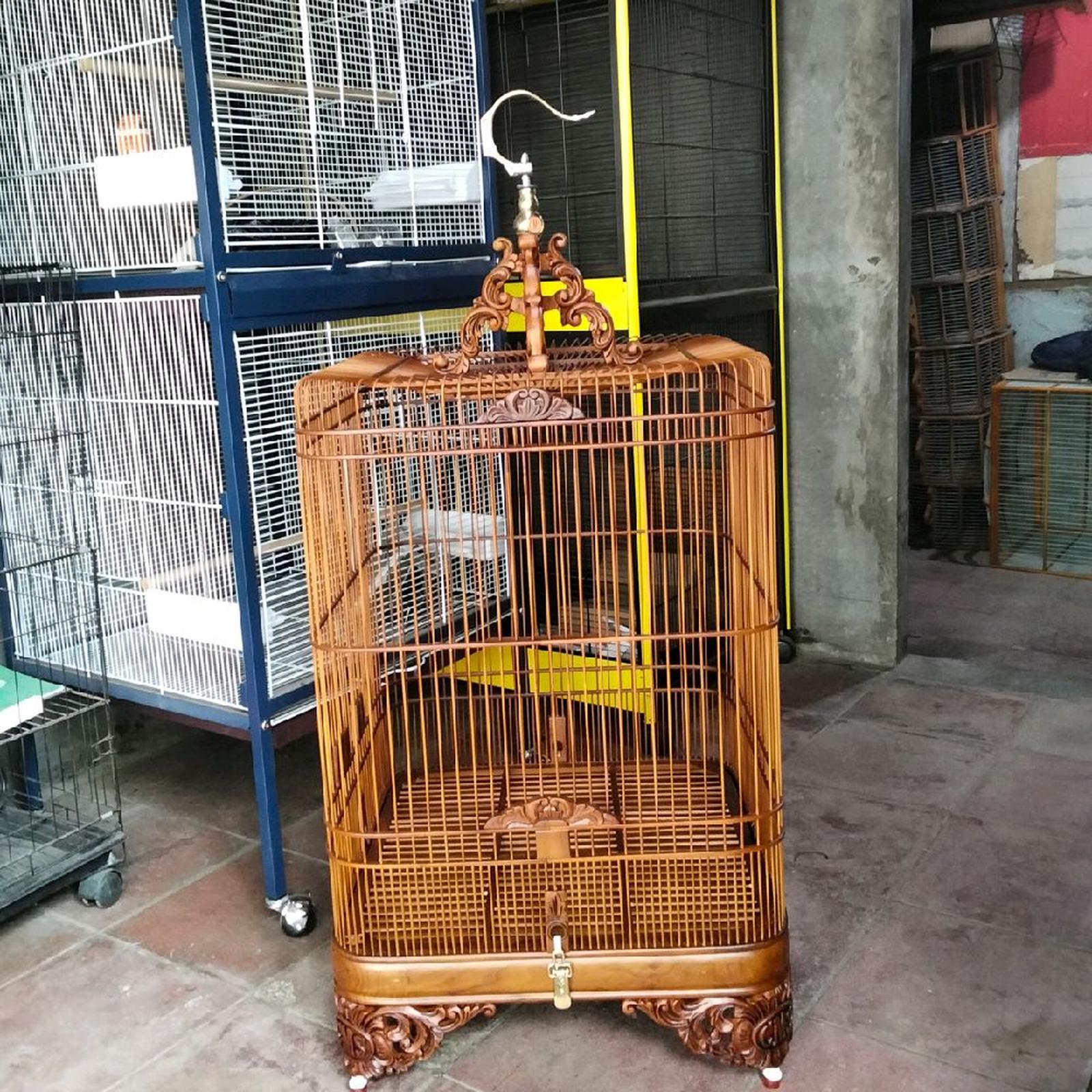 Kandang burung cucak Rowo ukiran kayu jati jari jari bambu P 50 cm x L 50 cm x T badan 68 cm