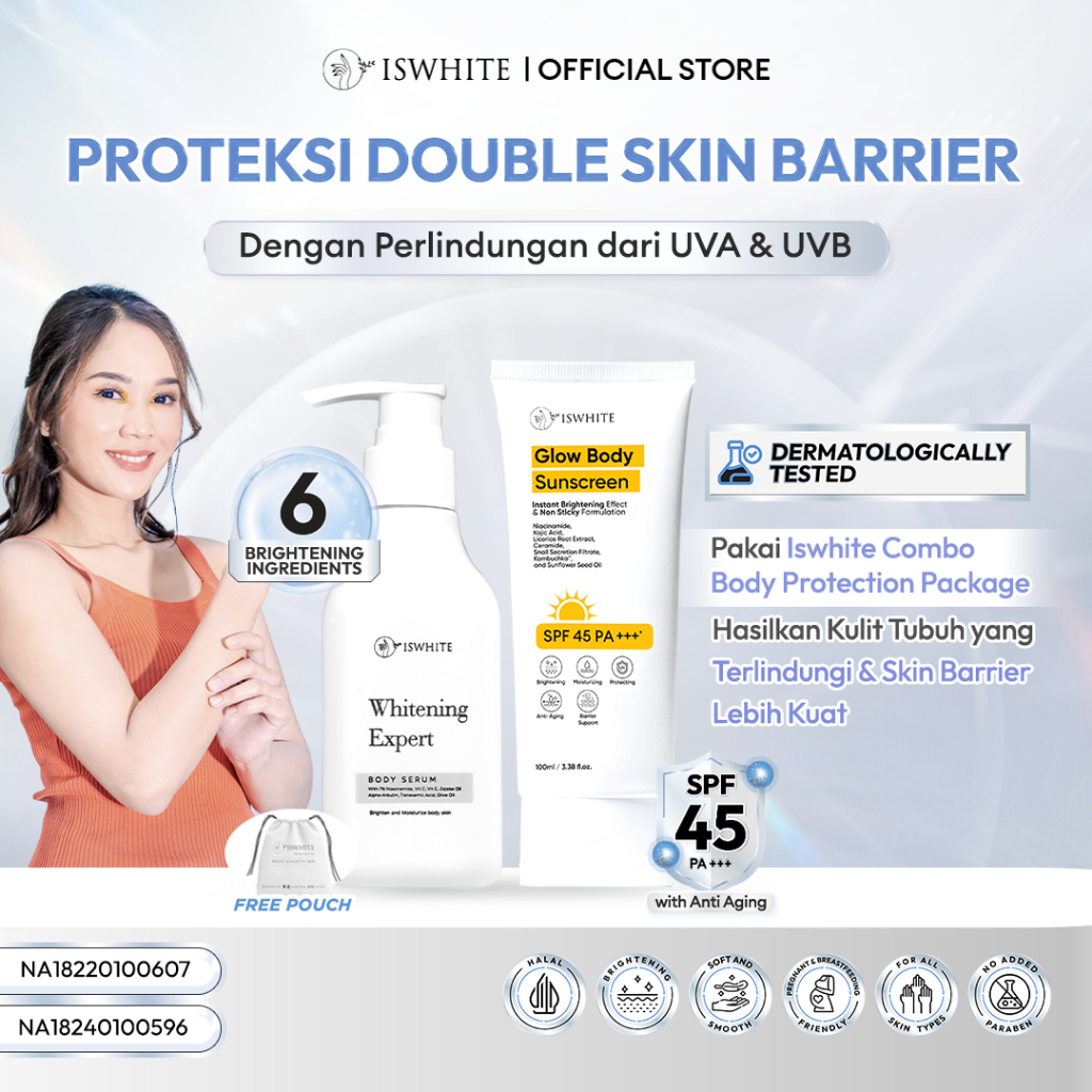 ISWHITE Combo Body Protection Package || Body Serum + Body Sunscreen SPF 45 PA+++ | Melindungi Kulit dari UVA UVB sekaligus Mencerahkan | Body care Aman Bumil, Busui, BPOM, Halal