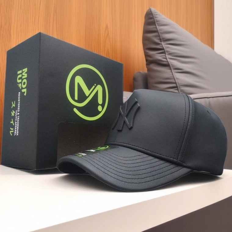 Topi Baseball Kulit Premium Pria – Hitam Elegan Logo Pin Besi Adjustable Strap