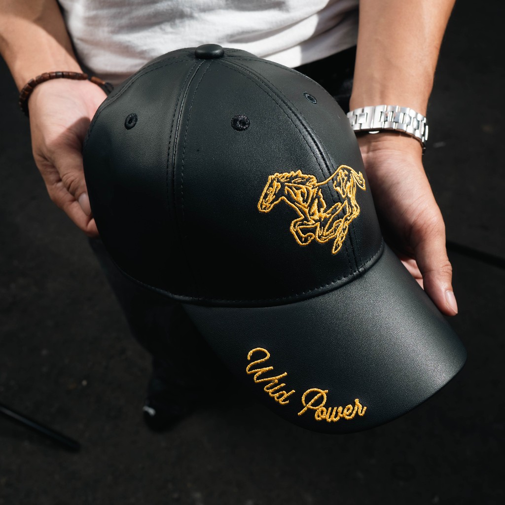 BOZRVK Wild Power Leather Black Baseball Cap Topi Baseball Kulit Sintetis Hitam Adjustable Snapback Elegan untuk Outfit