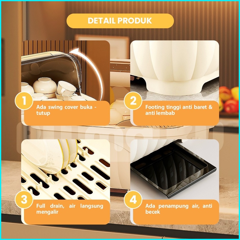 Rumaku Rak Piring Plastik Dengan Tirisan Air Dan Tutup Transparan Tempat Penyimpanan Mangkuk Garpu Sumpit Anti Debu